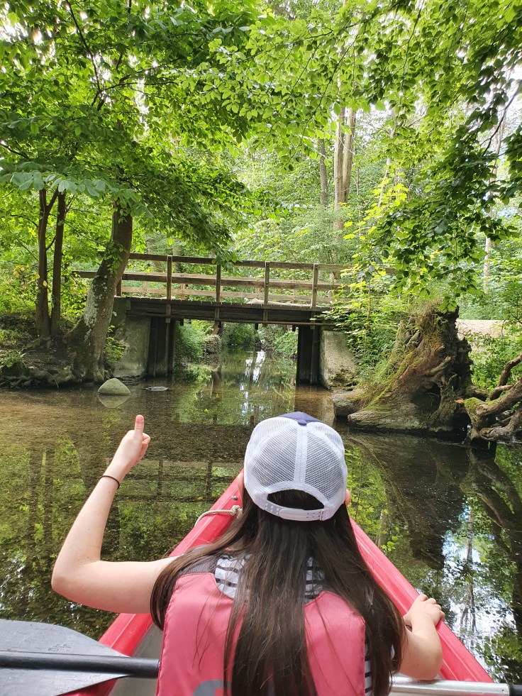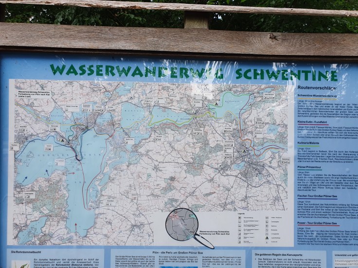 Unsere zweistündige Tour führt uns vom Kanuverleih an der Bundesstraße 430 entlang der Schwentine über den Mühlensee, den Großen Plöner See Schwanensee, Stadtsee und Kleinen Plöner See. Die Strecke ist sehr abwechslungsreich, mal paddeln wir über’s offene Wasser, mal in engen Kanälen, mal geht es über eine Bootsrutsche und mal müssen wir aussteigen und ziehen, weil das Wasser zu flach ist. Auch zu sehen gibt es viel, das Plöner Schloss, hinter üppigem Grün versteckte große und kleine Häuser, im glasklaren Wasser nicht nur die Wasserpflanzen, sondern bis zu armlange Fische und natürlich viele Wasservögel. Wir finden die Tour herrlich und würden beim nächsten Mal einen ganzen Tag einplanen, um auch an den Stränden halten und baden zu können!