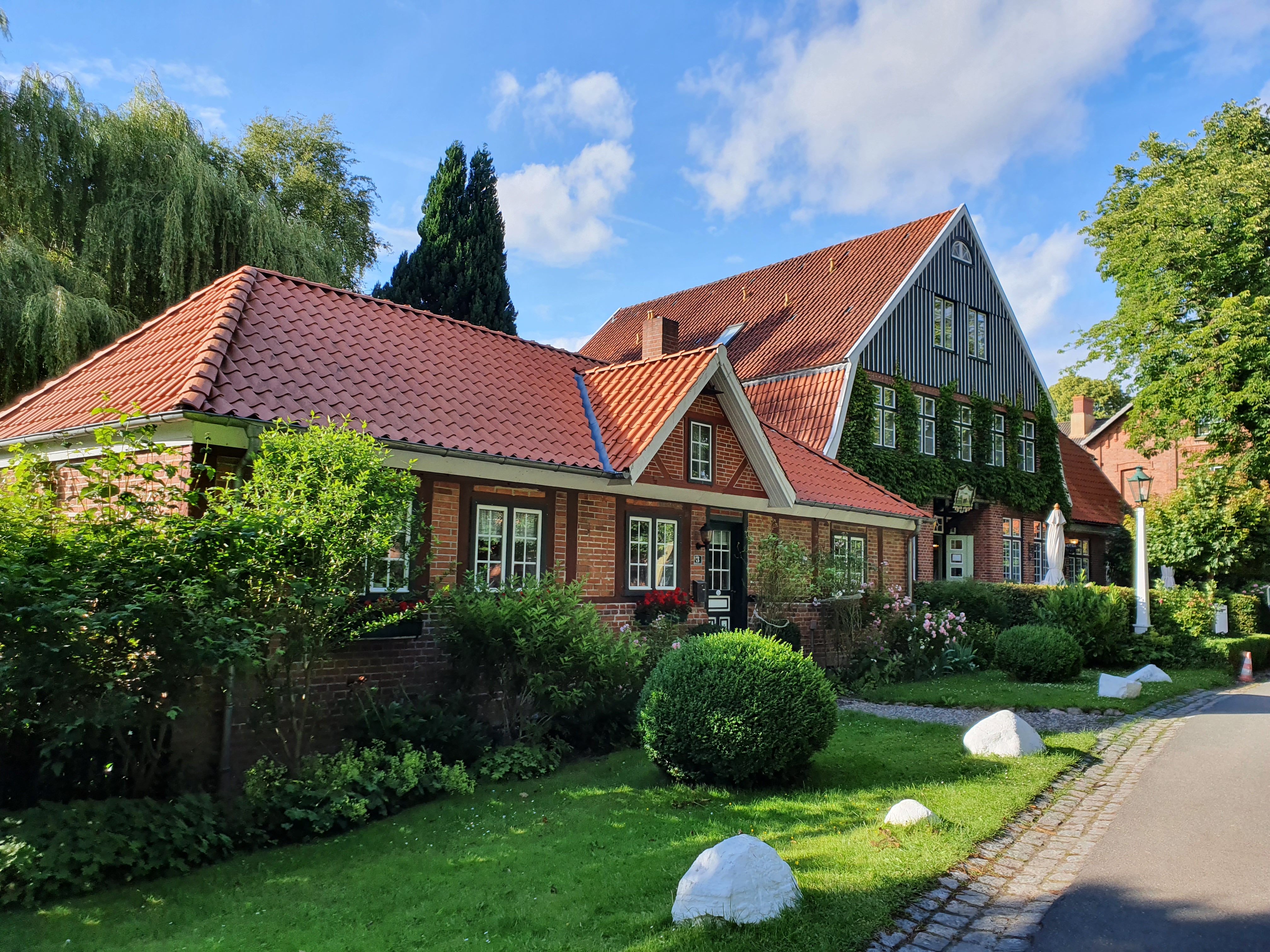 Zum hübschen Gut Panker gehören (neben einem Hotel, einem Gestüt sowie Geschäften und Galerien in den Gutsgebäuden) ein Gourmet- und Sternerestaurant „1797“ und das „normale“ Restaurant „Ole Liese„. Letzterem statten wir einen Besuch ab und sind begeistert von der schönen (Landhaus-)Atmosphäre und der kreativen Küche. Die gesamte Gutsanlage befindet sich seit dem 18. Jahrhundert im Besitz der Landgrafen von Hessen, was wir erst beim Studium der Weinkarte merken.