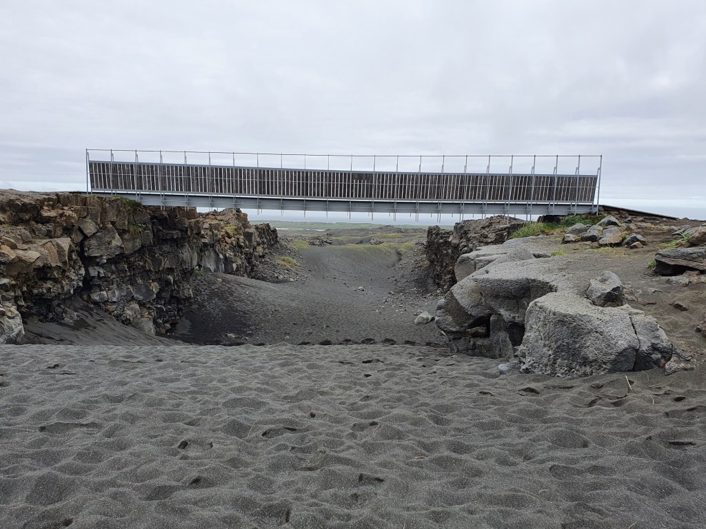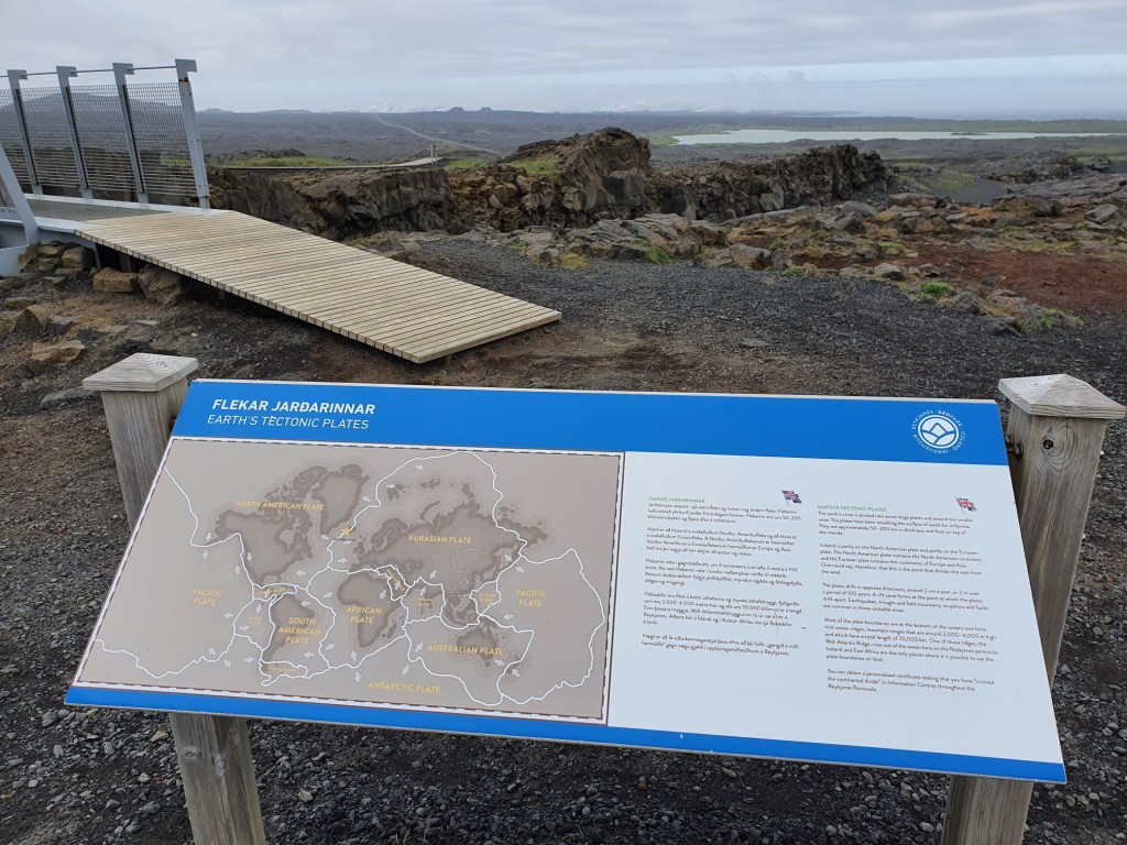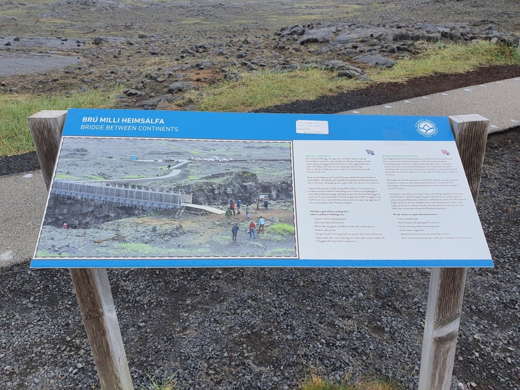 Auf der Straße 425 fahre ich in den äußersten Westen der Halbinsel. Hier befindet sich die nächste Station Brúin milli heimsálfa, besser bekannt unter „Brücke zwischen Kontinenten„. Schon wieder geht es um Plattentektonik und den Mittelatlantischen Rücken. Nur an wenigen Stellen der Erde kann man so deutlich wie hier sehen, wie zwei Kontinentalplatten auseinander driften (eine weitere solche Stelle liegt ebenfalls auf Island, in Thingvellir, siehe Island: Golden Circle mit Geysir, Gullfoss und Thingvellir). Über den Graben, der jährlich zwei bis drei Zentimeter breiter wird, ist besagte Brücke gespannt, flugs lässt sich mal eben zwischen Eurasien und Nordamerika hin- und herhüpfen. Ein paar Schilder liefern den geologischen und geographischen Hintergrund, sogar eine Selfie-Idee fehlt nicht. Für mich als Geographin faszinierend!