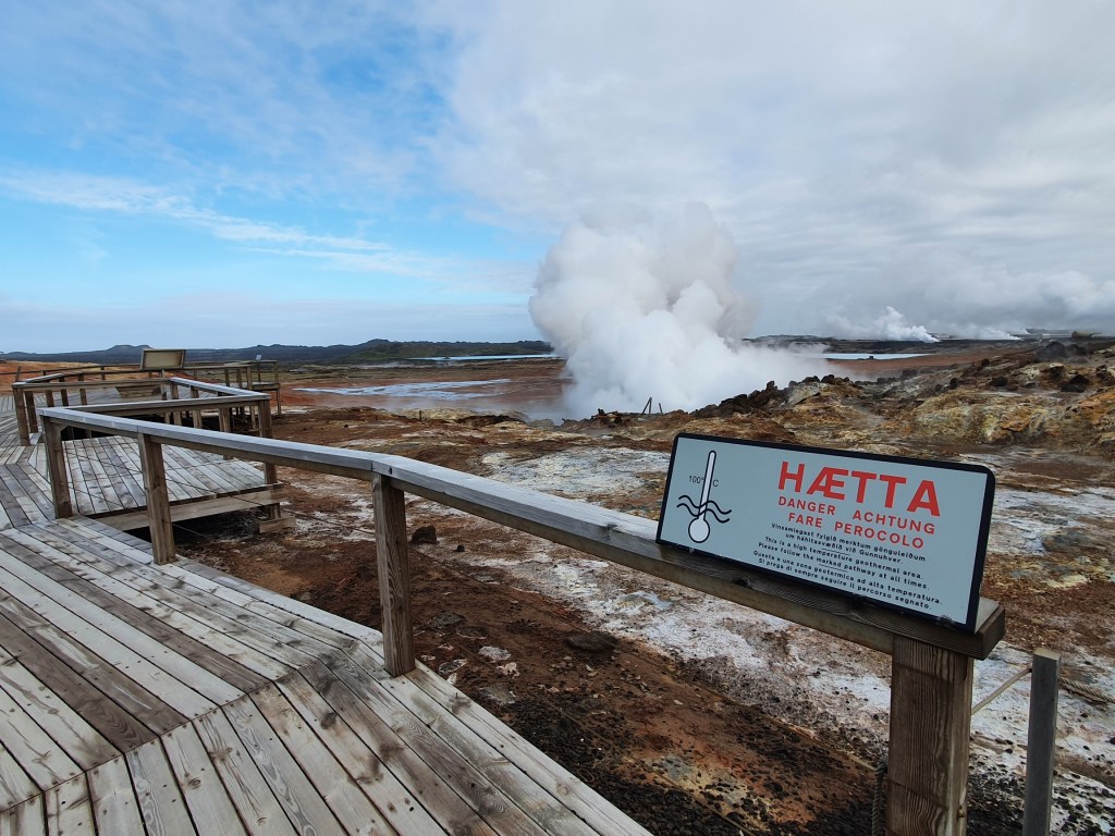 Schon auf der Brücke stehend sieht man in einiger Entfernung ziemlich viel Dampf: ein so großes Geothermalgebiet? Was aber vor allem dampft, ist das Ergebnis der Forschungen des „Iceland Deep Drilling Projects“, ein Geothermie-Tiefenbohrprojekt mehrerer isländischer Energieversorger. Ein kleines „Touristen-Geothermalgebiet“ gibt es dann aber doch, die Gunnuhver Hot Springs, die die größte Schlammquelle Islands beherbergen. Diese ist nicht ungefährlich und spuckt mitunter meterhoch Schlamm aus, bei meinem Besuch jedoch nur heißen Dampf. Neben zahlreichen Warnschildern (nicht wenige Besucher haben sich zu nah herangewagt und verbrüht) wird auch die Sage des namensgebenden Gespensts „Gunna“ erzählt, das in diese Quelle verbannt wurde (vielleicht ist sie es, die den Dreck wirft?). Unweit dieses Gebiets kann auch noch ein Leuchtturm bestaunt werden.