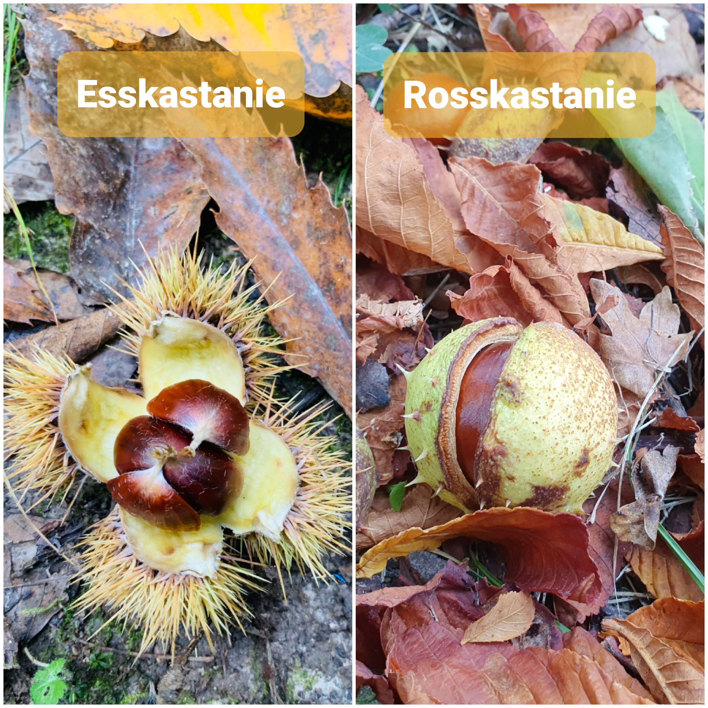 Herbstzeit ist Kastanienzeit und wir haben das Glück, ganz in der Nähe von berühmten Edelkastanienorten zu wohnen: Kronberg und Königstein-Mammolshain, das sich sogar „Edelkastaniendorf“ nennen darf (weitere größere Baumbestände gibt es im benachbarten Oberursel). Die Edel- oder Esskastanie (Castanea sativa), Baum des Jahres 2018, produziert sehr leckere essbare Früchte, die Maronen, in Hessen auch Keste genannt (Pfalz: Keschde, Schweiz Marroni). Die Esskastanie gehört übrigens zu den Buchengewächsen und ist nicht mit der Rosskastanie (Aesculus) verwandt. Letztere ist botanisch betrachtet Teil der Seifenbaumgewächs-Familie und ihre Früchte, mit der wir im Herbst gerne basteln und dekorieren, sind nicht essbar.