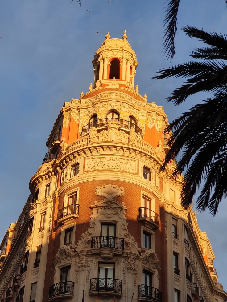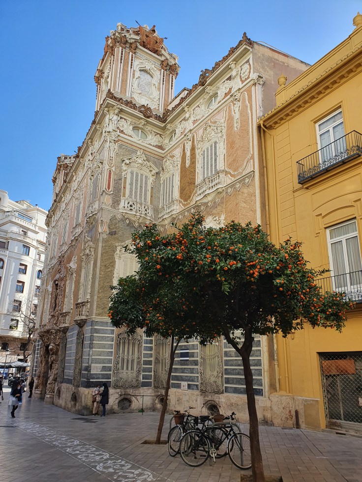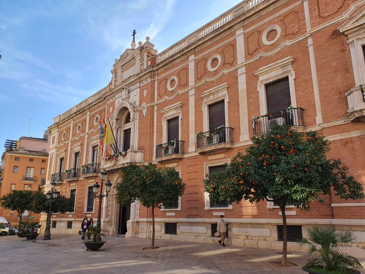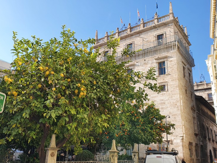 Wenn ich gefragt würde, ob ich Valencia mit einer Farbe beschreiben kann, so wäre dies sicherlich „orange“. Das liegt insbesondere daran, dass die drittgrößte Stadt des Landes die Orangenhauptstadt Spaniens ist. Sogar überall in der dicht bebauten Altstadt stehen auf fast jedem Platz und vor vielen Gebäuden Orangenbäume, vereinzelt auch Mandarinen-, Pomeranzen- und Zitronenbäume. Für uns aus dem Winter kommende Nordlichter wirkt dies jetzt im Januar besonders schön, da die Bäume momentan unzählige Früchte tragen – sofort stellt sich ein Mittelmeer- und Urlaubsfeeling ein!