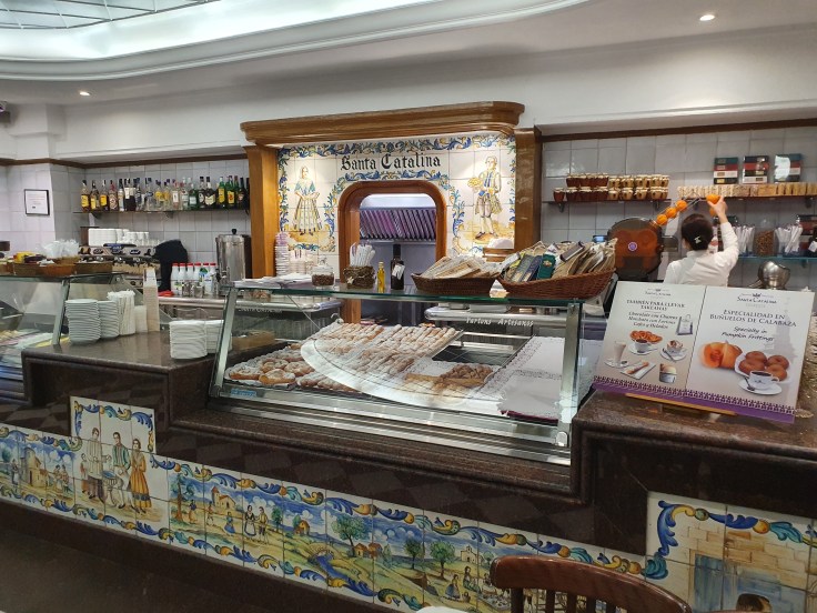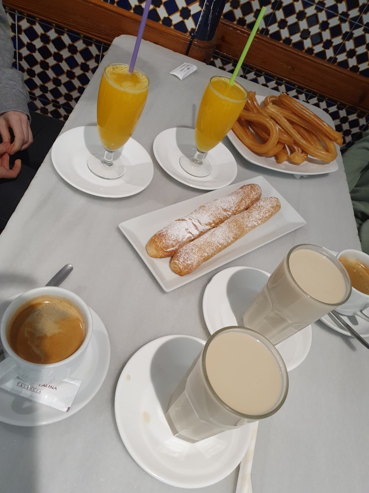 Frühstück in Spanien ist eher etwas für die Süßschnäbel. Zwei lokale Besonderheiten hat Valencia zu bieten: Horchata de chufa (valencianisch: Orxata de Xufa) und Fartóns. Horchata de chufa wird aus Erdmandeln gemacht, die gemahlen und gepresst werden. Zusammen mit Wasser und Zucker ergibt sich daraus eine milchige Flüssigkeit, die kalt getrunken wird. Horchata ist mitunter an Straßenständen, im Zentralmarkt und in einigen Cafés (insbesondere in eigens darauf ausgerichtete Orxateries oder Horchaterias) erhältlich, wir trinken sie in der hübsch gefliesten Horchateria Santa Catalina in der Altstadt. In die kalte Horchata wird gerne lauwarmes Hefegebäck, die Fartóns, getunkt, die es mit und ohne Cremefüllung gibt. Alternativ sind vielerorts zum Frühstück oder auch ganztägig als Snack die spanienweit verbreiteten Churros (in Öl frittiertes Spritzgebäck) erhältlich, die bevorzugt in heiße Schokolade gedippt genossen werden.