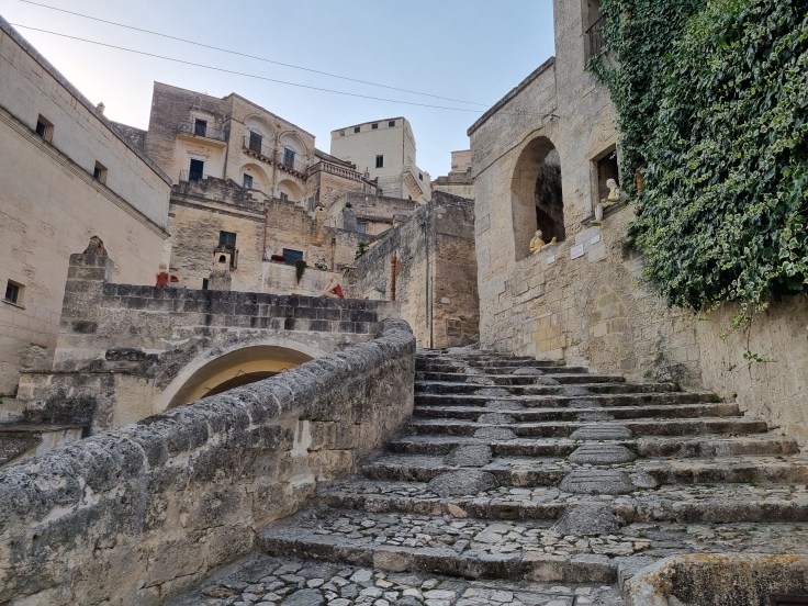 Wer sich mit Matera beschäftigt, stößt schnell auf die Aussagen: „Vom nationalen Schandfleck (Anfang/Mitte des 20. Jahrhunderts) zum UNESCO-Weltkulturerbe (1993) und Kulturhauptstadt Europas (2019)“. Eine unglaubliche Wandlung innerhalb von weniger als 50 Jahren! In der Tat hat die Stadt der Sassi (wörtlich übersetzt Steine) – so wird heute auch die Altstadt genannt (unterteilt in Sasso Barisano und Sasso Caveoso) – eine sehr wechselvolle Geschichte. Matera ist eine der ältesten Städte der Welt, schon in der Steinzeit waren die Grotten im weichen Kalkstein rechts und links der Schlucht (Gravina) besiedelt. Nach einer wechselvollen Geschichte mit Blütezeiten und Niedergängen lebten zu Beginn des 20. Jahrhunderts in diesen über die Jahrhunderte „ausgebauten“ Höhlen nur noch die ärmsten Menschen, ohne Wasser und Strom und unter katastrophalen hygienischen Zuständen. Darauf machte nicht zuletzt der Autor Carlo Levi mit seinem Buch „Jesus kam nur bis Eboli“ aufmerksam, was zu einer Evakuierung und Umsiedlung dieser Menschen in den 1950er Jahren führte. In den Folgejahren haben Architekten, Stadtplaner, öffentliche und private Investoren (darunter aus finanziellen Gründen nur wenige der ehemaligen Bewohner) nach und nach die alten Höhlenwohnungen ausgebaut und modernisiert. Heute sind viele der Höhlen – aber noch längst nicht alle, wie wir hinter der einen oder anderen provisorischen Türe sehen – hübsch hergerichtet und dienen als Restaurants, Shops, Hotels und Pensionen.
