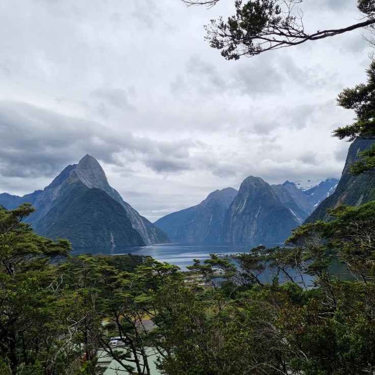 Angekommen am Milford Sound müsst ihr die Entscheidung treffen, ob ihr kostenlos oder kostenpflichtig (momentan 25 NZ$ für 5 Stunden) parken wollt. Auch hier lohnt es sich, früh da zu sein, denn wir finden gut einen Parkplatz an der Deepwater Basin Road direkt neben dem Flughafen. Von dort aus führt ein schöner Fußweg vorbei am Flughafen und durch den Busch zum Schiffsterminal, nach 10 Minuten erreicht man den kostenpflichtigen Parkplatz, nach weiteren 10 Minuten die Anlegestelle. Die 25 Dollar haben wir gerne gespart! Da wir recht früh dran sind, machen wir auch noch kurz hinter dem Flughafen den Milford Foreshore Walk (dauert offiziell 20 Minuten mit zahlreichen Schautafeln), den wir jedem ans Herz legen möchten. Denn hier aus haben wir eine traumhafte Sicht auf den Fjord! Uns hat dieser Blick fast besser gefallen als der vom Milford Lookout Track (hinter dem Parkplatz/der „Tankstelle“ dem Café geht es nach oben auf den Berg, dauert ebenfalls ca. 15-20 Minuten), wer Zeit hat, sollte aber beide kurze Walks machen.