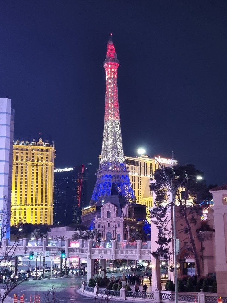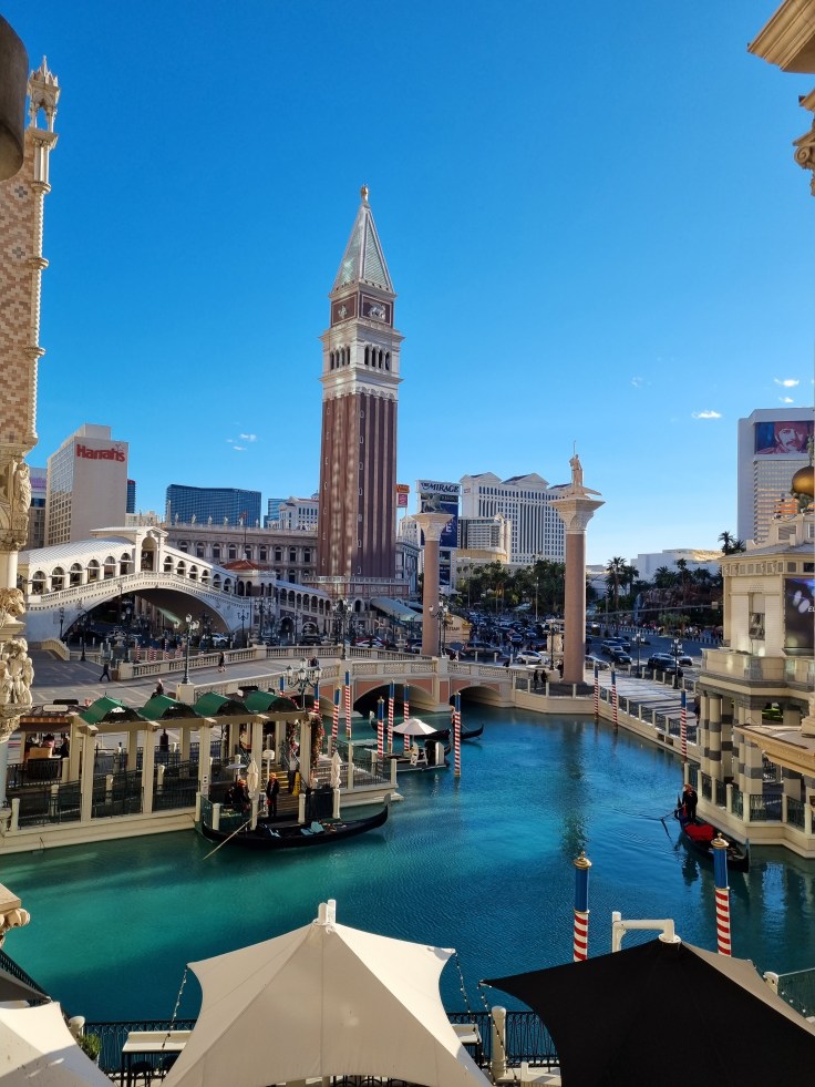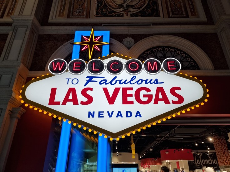 Einer unsrer Uber-Fahrer in Los Angeles sagte zu uns: „Nach Las Vegas müsst ihr nachts anreisen, bei Dunkelheit ist die Stadt am Schönsten“. Ja, da ist was dran, denn diese Kunstwelt voller blinkender Lichter in der Wüste Nevadas zeigt sich dann in voller Pracht. Las Vegas verdankt seinen Boom der Legalisierung des Glücksspiels 1931 und ist heute die größte Stadt Nevadas mit über 600.000 Einwohnern. Die Stadt zieht Gäste unterschiedlicher Altersgruppen und Nationen an – vor allem Collegestudenten, Clubkameraden und JunggesellInnen-Abschiedsfeiernde, die hier „einen drauf machen“, Touristen, die Las Vegas als Ausgangspunkt für diverse Nationalparks nutzen, natürlich viele Glücksspieler und Leute, die sich das ganze Spektakel einfach einmal anschauen wollen, weil es in dieser Form weltweit einmalig ist. Durch das große Zimmerangebot sind die Hotelzimmer vergleichsweise günstig, zumindest in den Hotels, die sich nicht direkt am Strip, dem Las Vegas Boulevard und Mittelpunkt des Treibens, befinden. Es gilt die Faustregel: Am teuersten sind die berühmten Themenhotels am Strip wie das Venetian oder das Bellagio. Je weiter man sich davon entfernt, desto günstiger wird es. Wir beziehen Quartier einen Block hinter dem Strip, den wir fußläufig problemlos erreichen können.