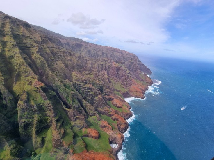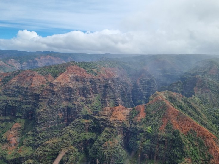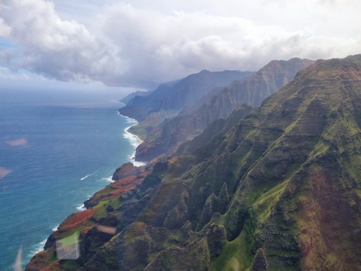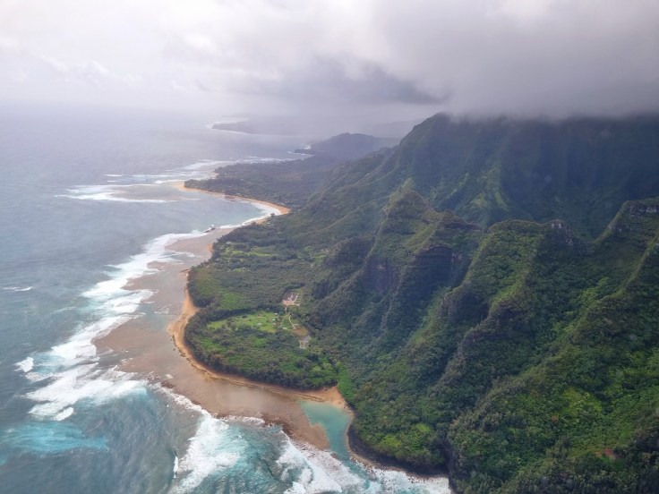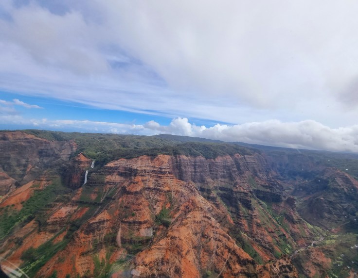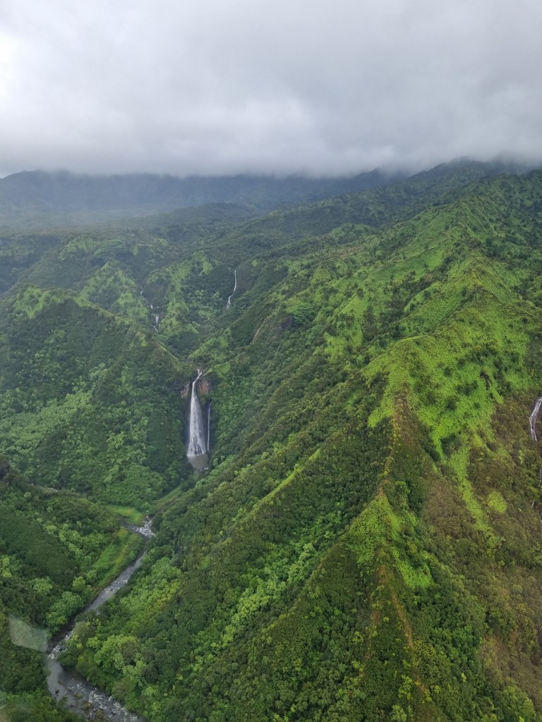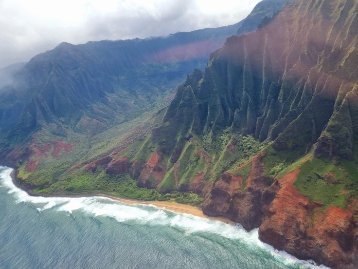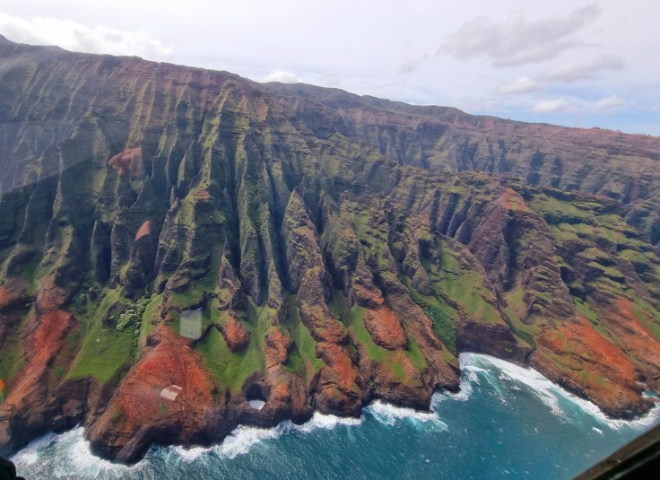 Ab dem Flughafen Lihue geht es los in die Luft. Bevor wir die Na Pali Coast erreichen, überfliegen wir weitere spektakuläre Landschaften. Als erstes die Jurassic Falls, den Wasserfall aus Teil 1 des Jurassic Park-Films, inmitten üppigstem Grün – nicht umsonst wird Kauai auch die Garteninsel Hawaiis genannt. Wenig später tauchen wir ein in den Waimea Canyon, den Grand Canyon des Pazifiks – ähnlich beeindruckend mit seinen rot gefärbten Hängen, aber im Vergleich zum Namensvetter mit viel mehr Grün und Wasserfällen. Und dann folgt das Highlight: die Na Pali Coast. Obwohl es leicht nieselt und die Wolken recht tief hängen, raubt uns der Anblick den Atem – die Bilder sprechen für sich.