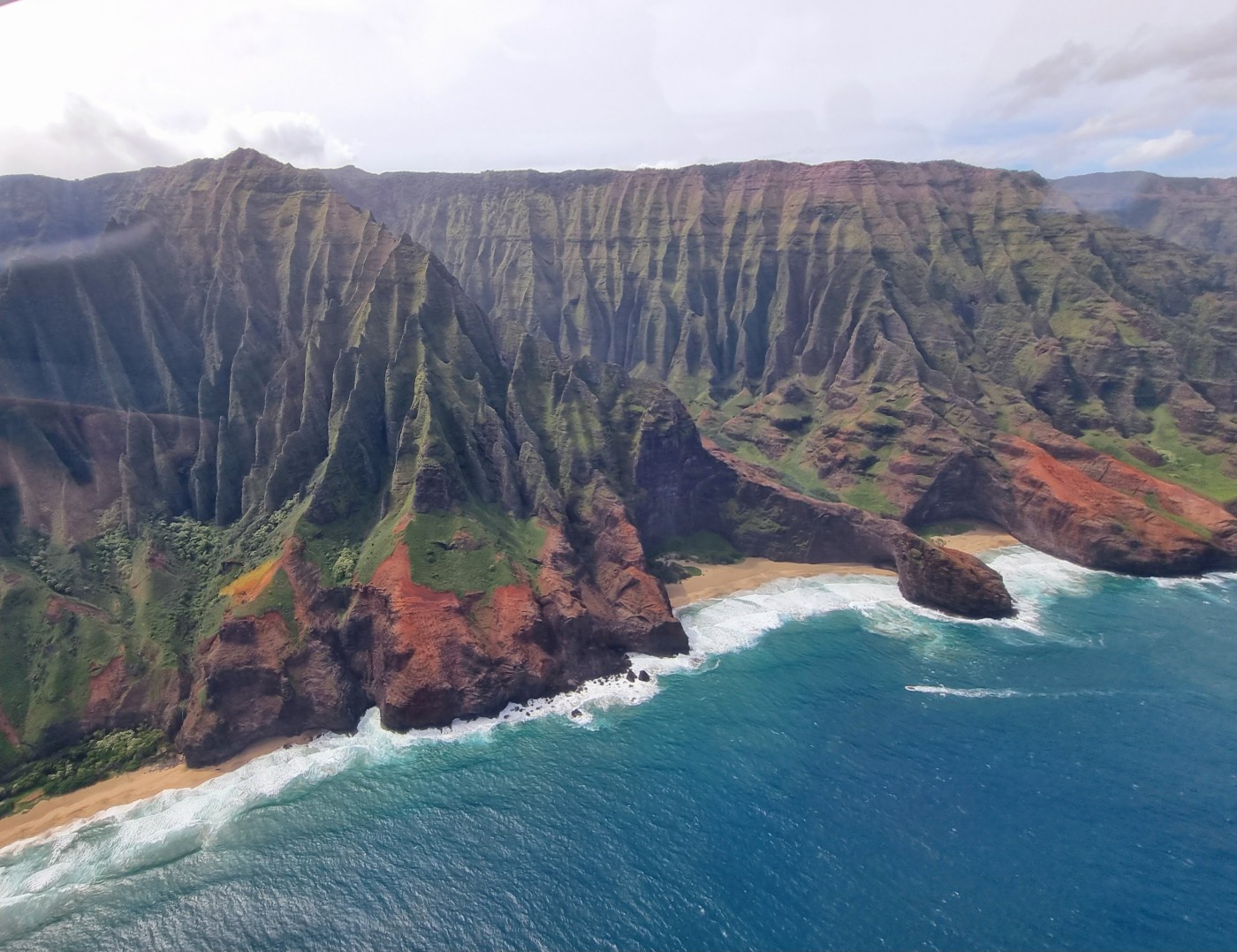 Ab dem Flughafen Lihue geht es los in die Luft. Bevor wir die Na Pali Coast erreichen, überfliegen wir weitere spektakuläre Landschaften. Als erstes die Jurassic Falls, den Wasserfall aus Teil 1 des Jurassic Park-Films, inmitten üppigstem Grün – nicht umsonst wird Kauai auch die Garteninsel Hawaiis genannt. Wenig später tauchen wir ein in den Waimea Canyon, den Grand Canyon des Pazifiks – ähnlich beeindruckend mit seinen rot gefärbten Hängen, aber im Vergleich zum Namensvetter mit viel mehr Grün und Wasserfällen. Und dann folgt das Highlight: die Na Pali Coast. Obwohl es leicht nieselt und die Wolken recht tief hängen, raubt uns der Anblick den Atem – die Bilder sprechen für sich.
