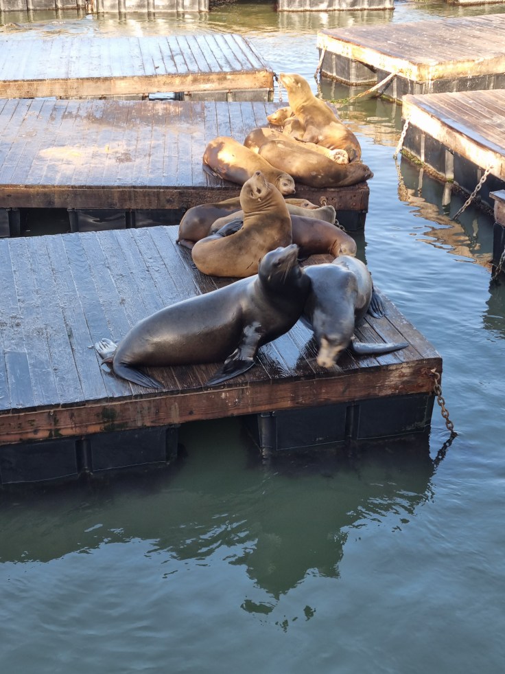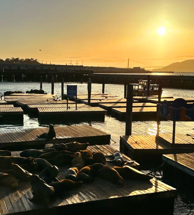 Schon beim Anflug über die Bay auf die Stadt sehen wir in der Ferne die Skyline mit der berühmten Golden Gate Bridge – die Vorfreude steigt. Mit dem Uber geht es zum Hotel an der Fisherman’s Wharf, ein guter Startpunkt für zahlreiche Aktivitäten. Als erstes schlendern wir dann auch durch das berühmte Hafenviertel. Wo früher Kutter anlegten und Fischer ihre Ware verkauften, ist heute eines der beliebtesten Touristenzentren der Stadt, davon zeugen zahlreiche Restaurants, Cafés, Shops und Attraktionen. Leider stellen wir fest, dass hier noch nicht wieder die Umtriebigkeit und Atmosphäre wie vor Corona herrscht, abends ist hier, selbst rund um den berühmten Pier 39, ‚tote Hose‘, auch Leerstände sind hier und da zu sehen. Ebenfalls weniger geworden sind die berühmten Seelöwen, die sich auf den Holzbohlen am Pier in der Sonne räkeln. Erfreulicher Nebeneffekt: Beim letzten Mal war der gelinde gesagt herbe Geruch viel schlimmer! Unser Tipp hier: Kommt in den Abendstunden, wenn die Sonne hinter der Golden Gate Bridge untergeht. Zauberhafte Stimmung!