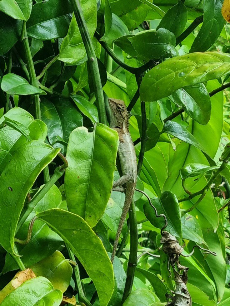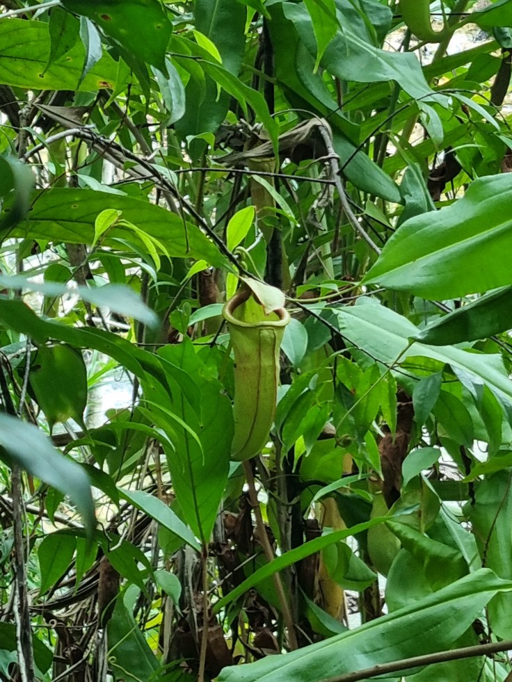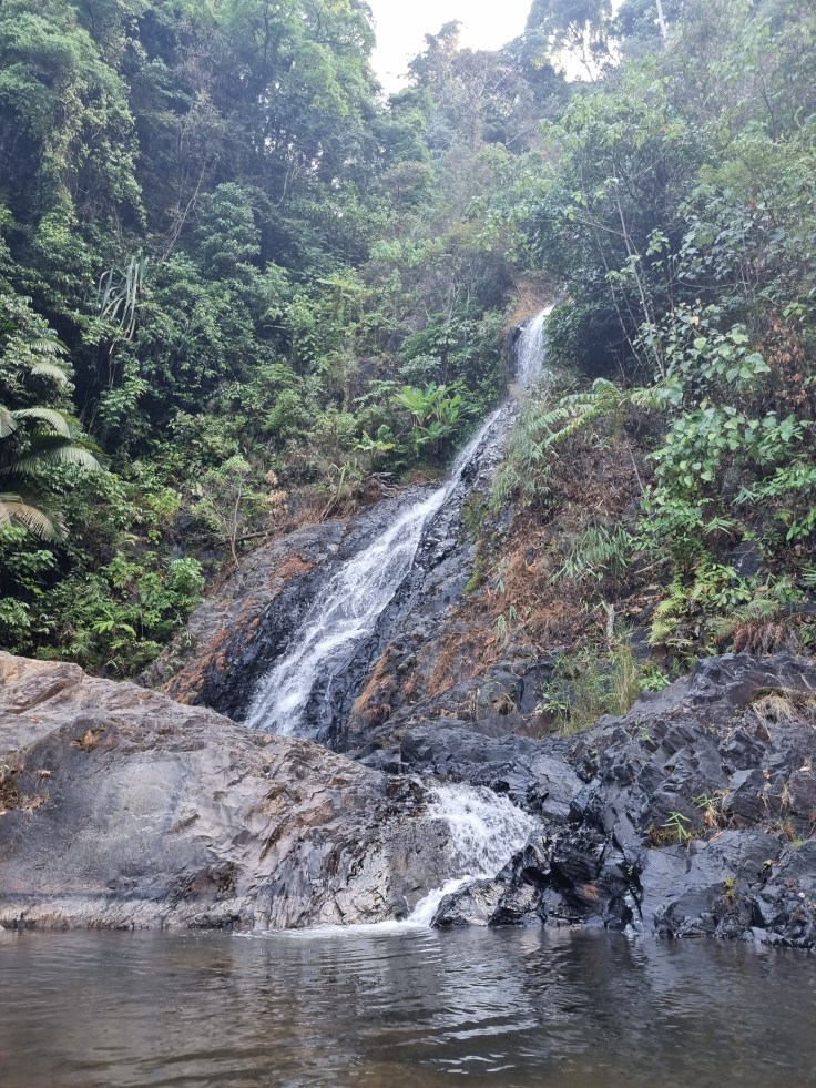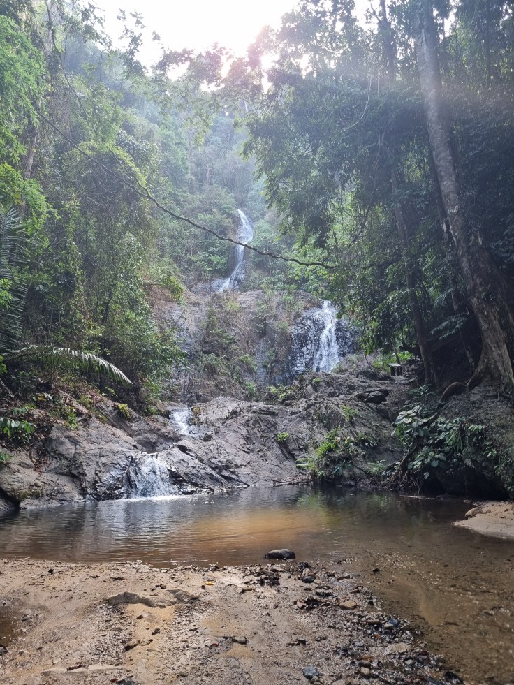 An diesem Morgen holt uns unsere Guide durch Südthailand mit Namen Kim im Hotel ab. Wie viele Thais, gerade im Tourismusgeschäft, hat sie sich einen „internationalen“, gut zu merkenden Vornamen gegeben. Als erstes nimmt Kim uns mit in den Khao Phanom Bencha Nationalpark, namensgebend ist der mit knapp 1.400 Metern höchste Berg in Krabi. Vom Parkeingang laufen wir, Kim mit ihrem strammen Schritt folgend, ein kurzes Stück auf gut gepflegten Wegen zum Wasserfall Huai To, der Hauptattraktion des kleinen Nationalparks. Über insgesamt 80 Metern Höhe ergießt sich dieser Wasserfall über mehrere Kaskaden und Becken, in denen man auch baden kann. Dafür haben wir keine Zeit und Baden ist später, informiert uns Kim. Da ich den Reiseplan vorher studiert habe, ahne ich: Diese kleine Wanderung war eher eine Art Test, ob wir wandertauglich sind … Zurück am Parkeingang schauen wir uns noch einen liebevoll gepflegten Garten mit Heil-, Gewürz- und Gemüsepflanzen an und Kim erklärt uns diverse Verwendungszwecke.