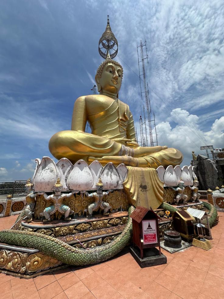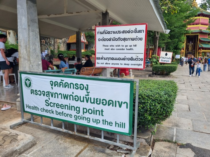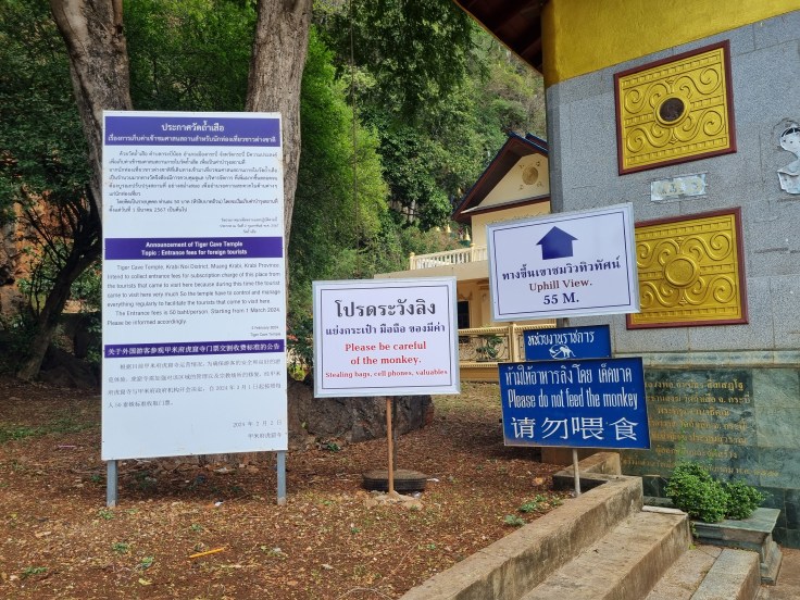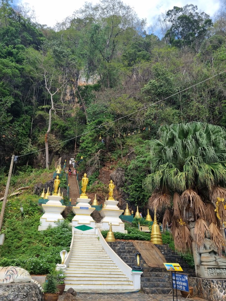 Die zweite Warnschildwelle beschäftigt sich mit dem Thema Gesundheit. Wir werden zwar nicht, wie ein Schild ankündigt, durchgecheckt, wohl aber müssen wir unsere Gruppe in eine Liste eintragen und ein Mönch gibt uns Ermahnungen mit auf den Weg. Ausreichend Wasser und Sonnenschutz haben wir selbstverständlich im Gepäck und so steigen wir langsam nach oben. Fast 1.300 Treppenstufen unterschiedlichster Höhe und Breite und oft in der prallen Sonne führen auf die Spitze des Karstkegels, dass es fast 40 Grad hat, macht die Sache nicht gerade leichter. Und so sehen wir auch, neben der berüchtigten Affenbande, schon bald Menschen kurz vor einem Hitzschlag und viele, die wieder umdrehen. Doch wer es nach oben schafft, wird belohnt: Mit einem grandiosen Blick in die umliegende Landschaft mit ihren malerischen Kegelbergen und natürlich dem majestätischen goldenen Buddha sowie einem Fußabdruck desselben. Auf dem Weg runter zittern bei uns allen die Beinmuskeln und die Knie werden ganz schön in Mitleidenschaft gezogen. Ohne Zweifel aber ein tolles, wenn auch extrem schweißtreibendes Erlebnis!