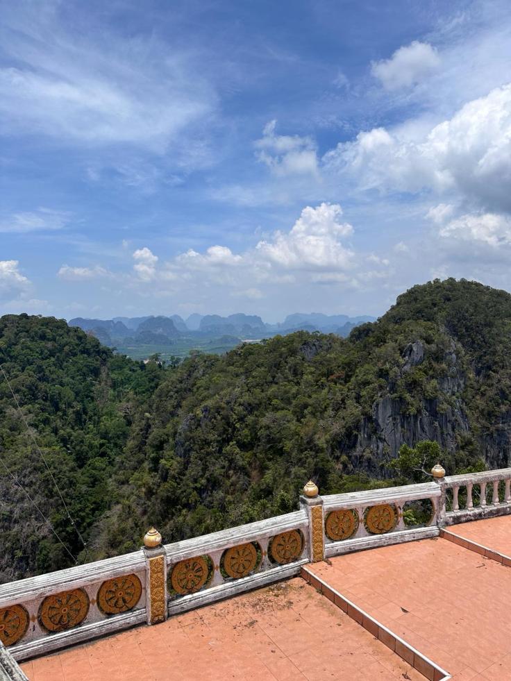 Immer noch in der Provinz Krabi heißt der nächste Stopp Tigerhöhlentempel (Wat Tham Sua), einer der bekanntesten Meditationstempel Thailands. Der Legende nach lebte hier ein Mönch mit einem Tiger zusammen, der ihn beim Meditieren bewachte. Nachdem wir einen kleiner Markt durchquert und Eintritt bezahlt haben, betreten wir mit bedeckten Schultern und Knien (entsprechende Kleidung kann falls nötig im Markt gekauft werden) sowie ohne Schuhe zunächst den „alten“ Teil des Tempels, der direkt an den Berg gebaut ist. Stufen führen in das Allerheiligste, nämlich die ehemalige Meditationshöhle des Mönchs. Im Hauptteil des Tempels, wo regelmäßig in großer Runde meditiert wird, nehmen Mönche Opfergaben entgegen.