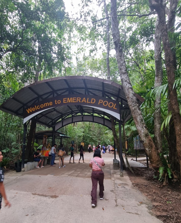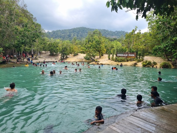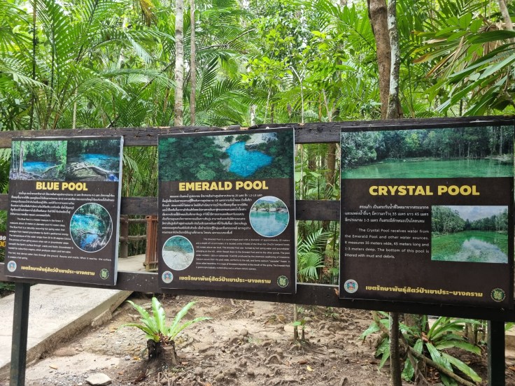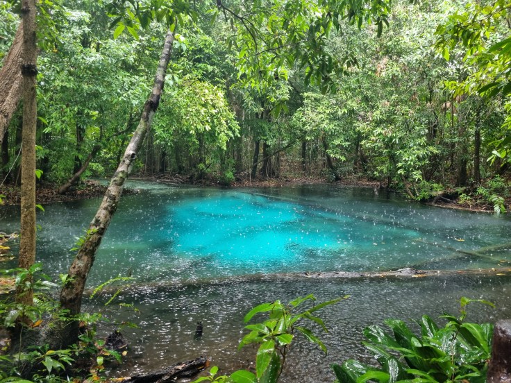 Ebenso gut tut uns der nächste Stopp: ein Bad im warmen (kalt wäre mir noch lieber gewesen) thermalen Quellwasser des Emerald Pool (Sa Morakot). Auch wenn es uns zugegebenermaßen nach dem Tigerhöhlentempel schwer gefallen ist: Nehmt zum Pool den etwas längeren (Bohlen-)Weg (ca. 1,4 Kilometer) rechts durch den Dschungel und nicht die „breite Wald-Autobahn“ (ca. 800 Meter). Ihr seht auf dem längeren und sehr viel „einsameren“ Weg zahlreiche andere Pools, fleischfressende Kannenpflanzen, Schmetterlinge und kleine Echsen – es lohnt sich! Auch wenn am Emerald Pool einiges los ist, ist das entspannende Bad eine Wohltat für unsere beanspruchten Muskeln. Anschließend laufen wir noch ein kleines Stück (600 Meter) weiter zum Blue Pool mit seiner türkisblauen Färbung, die von Treibsand im Untergrund herrührt. Aus diesem Grund und weil dieser Pool von heißem Thermalwasser gespeist wird, ist Baden hier verboten. Dass es mittlerweile angefangen hat zu regnen, stört uns kaum. Toilettenhäuser mit Umkleidemöglichkeiten sind vorhanden, so dass wir mit trockener Kleidung unsere Fahrt in die Provinz Trang zu unserem nächsten Übernachtungsquartier antreten können.