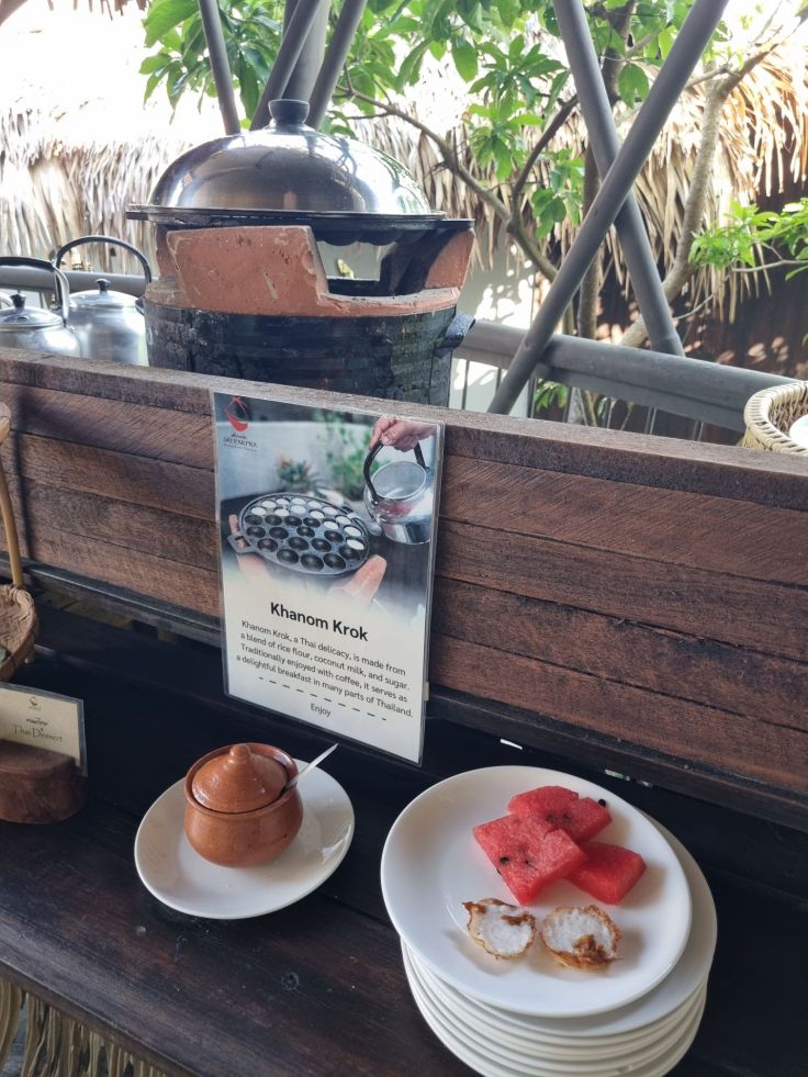 Auf der Weiterfahrt halten wir an einem Straßenstand, um Khanom Krok für uns zu kaufen, das nirgends besser sein soll als hier. Khanom Krok sehen aus wie holländische Poffertjes, es sind süße Mini-Kokos-Reis-Küchlein, die in einer speziellen Pfanne zubereitet und zum Frühstück oder als Dessert gegessen werden. Lecker! Meine Stimme im Hinterkopf sagt allerdings auch: „Das soll uns bestimmt Energie für den nächsten Programmpunkt geben.“