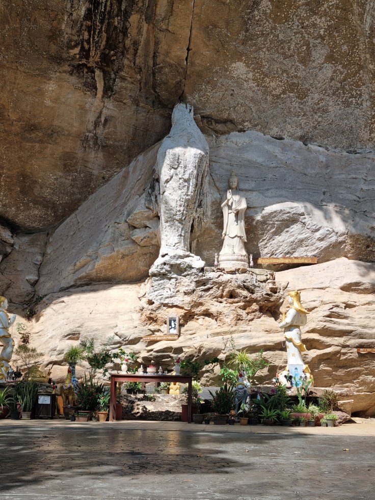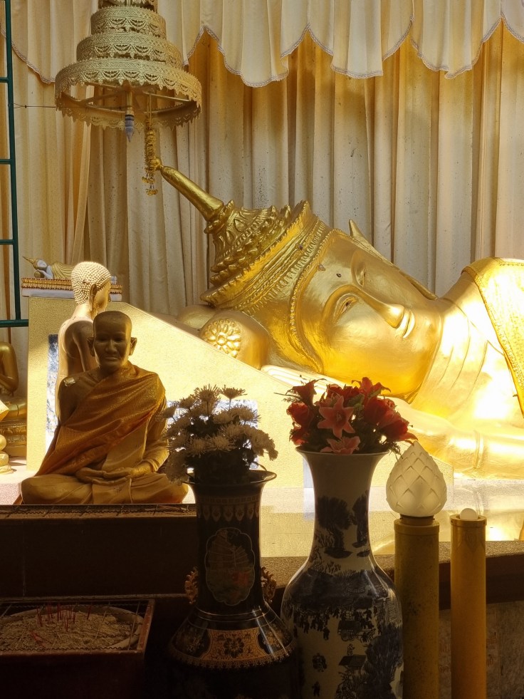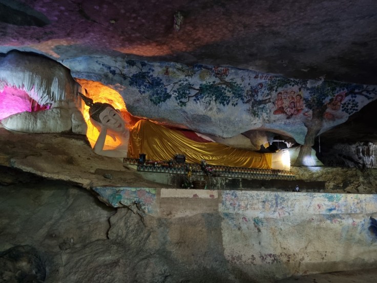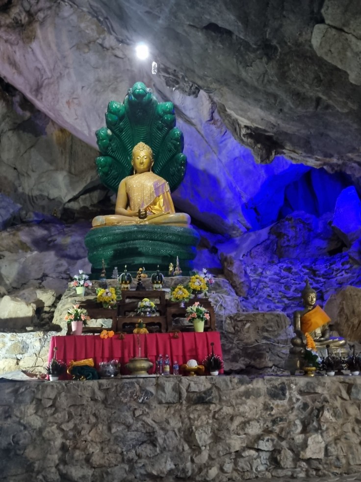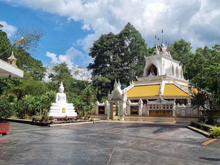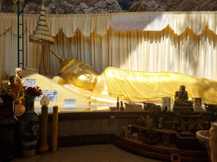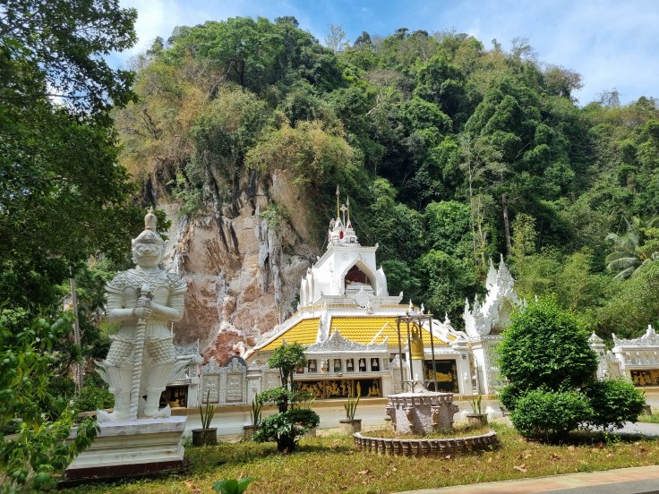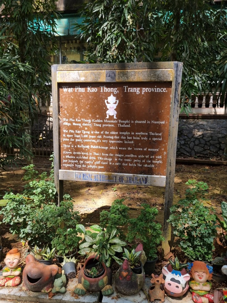 Von Trang aus (siehe Schlemmen in Thailand) fahren wir zunächst zum Wat Phu Khao Thong, auch Golden Mountain Temple genannt, in Nam Phut. 1.400 Jahre alt, ist dies einer der ältesten Tempel in Südthailand. Der ältere Teil des Tempels liegt am Fuß eines Karstberges und ein Tropfstein im Außenbereich bildet eine „natürliche Buddhastatue“. Die Hauptattraktion ist jedoch ein liegender Buddha, der eine „Krone von Manorah„, typisch für einen traditionellen thailändischen Tanz, trägt. Dies ist einzigartig, nirgendwo sonst trägt eine Buddhafigur diese spezielle Krone.