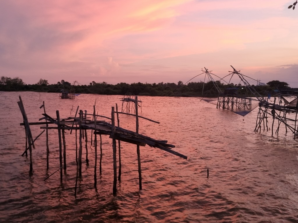 Schließlich kommen wir an unserer Unterkunft direkt am Thale Noi See an, wo wir entspannt den Nachmittag am Pool verbringen (siehe Ende dieses Blogs). Am nächsten Morgen geht es noch vor Sonnenaufgang mit dem Longtailboot direkt vom Hotelsteg aus los auf den See. Wir sind noch etwas müde, der sanft-schaukelnde Rhythmus, mit dem uns der Bootsführer bedächtig mit einer langen Stange auf den See hinaustreibt, lässt uns fast wieder eindösen. Dann allerdings sorgt ein unvergleichliches Schauspiel, Hauptdarsteller die Sonne, dafür, dass wir aus dem Staunen gar nicht mehr heraus kommen: Das orange-rote Farbenspiel vor den Stelzenhäusern der Fischer ist einfach unbeschreiblich schön.
