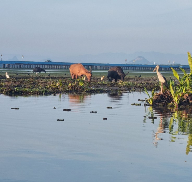 Schön anzuschauen sind auch die zahlreichen Wasserbüffel, die ihr morgendliches Frühstück einnehmen. Ein Teil steht grasend auf dem „Festland“, die allermeisten bewegen sich aber (halb-)schwimmend durch das flache Gewässer, halten immer wieder an, um etwas zu fressen und lassen sich von uns in keinster Weise stören. Sie werden morgens von ihrem Bauern freigelassen, versorgen sich selbst und kehren abends wieder in den Stall zurück, bis auf wenige „nasty boys“, wie uns unser Guide lachend erzählt.