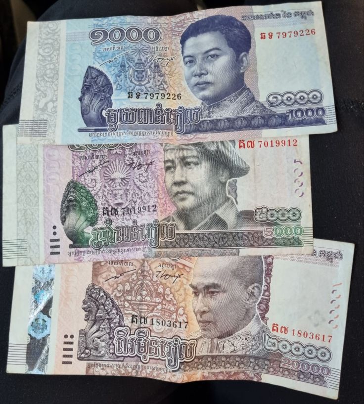 Am Flughafen könnt ihr auch Geld tauschen. Die kambodschanische Währung ist der Riel, 1.000 Riel entsprechen ganz grob 25 Euro-Cent oder 25 Dollar-Cent (Stand Frühjahr 2024, stark schwankend). Überall im Land kann mit Dollar bezahlt werden (eventuell wird das Rausgeld dann in Riel zurückgegeben). Wer also genügend Dollar in möglichst kleinen Scheinen bei sich trägt, braucht eigentlich vor Ort nichts zu tauschen und ist bestens vorbereitet.