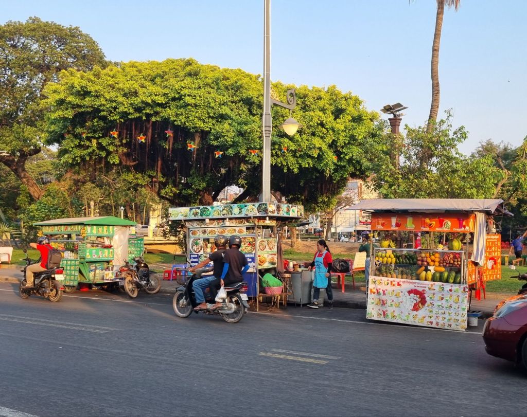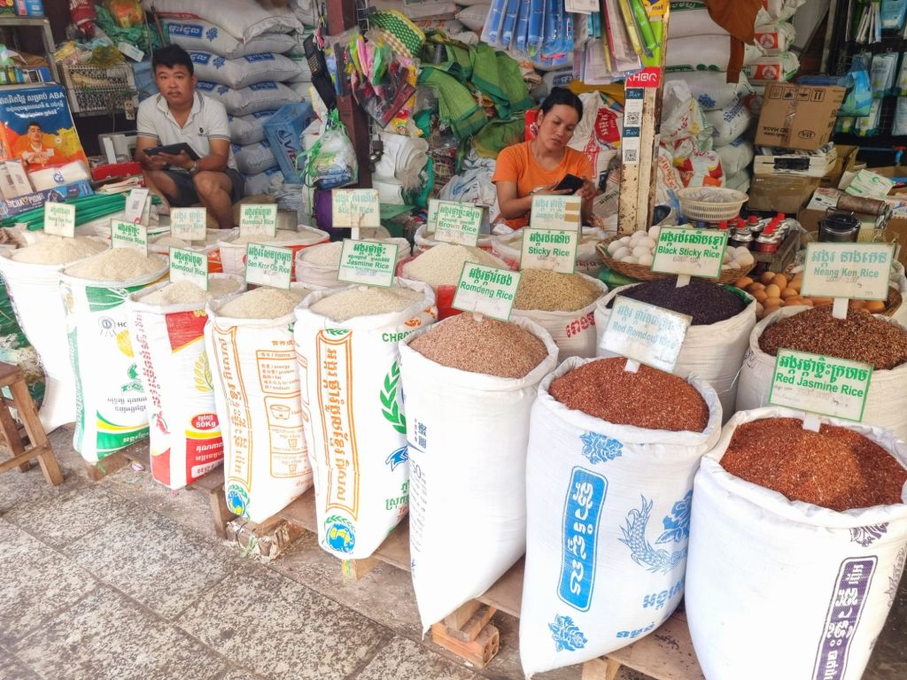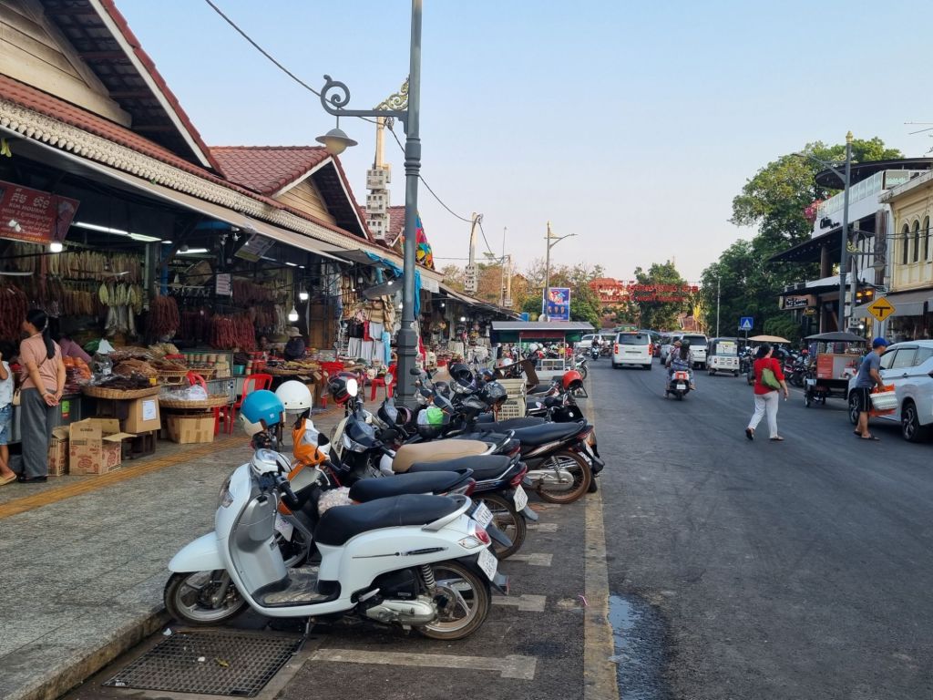 Im Stadtzentrum liegen gleich mehrere touristische Anziehungspunkte direkt nebeneinander: die bunt geschmückte All Cheers und Pub Street (Street 08) mit ihren Kneipen und Restaurants, der Alte Markt (Old Market) – der einzige Markt, wo sich auch Einheimische mit Nahrungsmitteln und Snacks versorgen (wir staunen über allein 16 Sorten Reis an einem Stand!) -, der Riverside Night Market an der Old Market Bridge und der Siem Reap Art Center Night Market. In diesem Quartier findet ihr also wirklich alles, was euer Herz begehrt: von billigen Souvenirs (Handeln ist nicht unüblich) über Kleidung, Handwerkskunst, Obst, Gemüse, Fleisch, Kleidung bis hin zu Essen in Food Stalls, kleinen und großen Restaurants. Aus europäischer Sicht ist natürlich alles sehr günstig. Uns fällt aber auf, dass die Preise in Kambodscha geringfügig höher sind als in Thailand, egal ob es sich um Essen oder um Souvenirs handelt. Auf jeden Fall lohnt es sich, sich das Gewusel hier einmal anzuschauen und hier und da etwas zu probieren und einen der leckeren Frucht-Smoothies zu trinken.