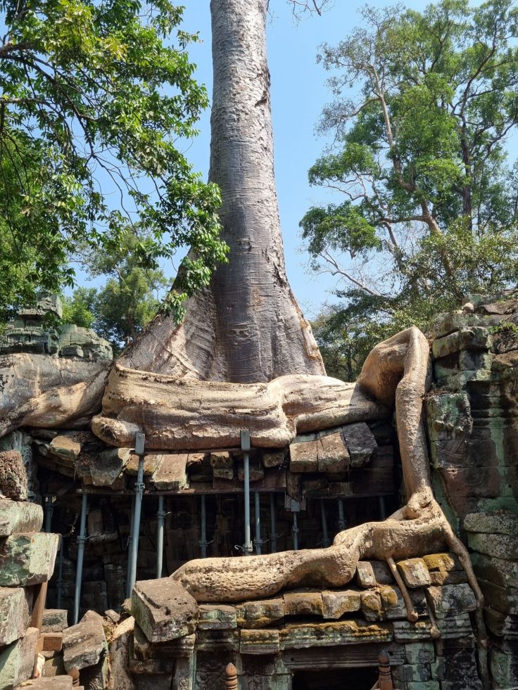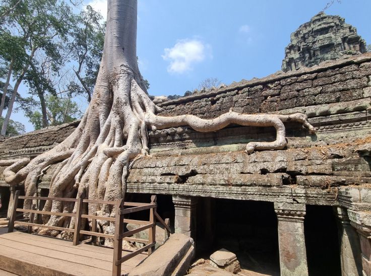 Nach dieser ausgiebigen Besichtigungsrunde von Angkor Thom flüchten wir erst einmal in den klimatisierten Van und sind froh, in diesem für ein paar Minuten zu sitzen. Unser nächster Halt ist am Ta-Prohm-Tempel (ca. 3 km nordöstlich von Angkor Wat; am westlichen Eingang gibt es zahlreiche Essens- und Souvenirstände und Toiletten). Der buddhistischen Klosterkomplex wurde ebenfalls im 12. Jahrhundert unter dem Khmer-Königs Jayavarman VII. erbaut und ist der Mutter des Königs gewidmet. Die Besonderheit dieses Tempels liegt darin, dass er nur teilweise wiederaufgebaut wurde. An vielen Stellen wurde der ruinenhafte Charakter bewusst erhalten, weil die Verantwortlichen festgestellt haben, dass die Besucher genau das einmal sehen wollen: wie die Natur sich die Gebäude zurückgeholt hat. Und so wachsen in höchst dekorativer Weise überall aus den halb verfallenen Tempelmauern Würgefeigen und Bäume mit ihren mächtigen, schlangenähnlichen Wurzeln, die sich ihren Weg durch die Steine suchen. Teils sind die Wurzeln so schwer, dass sie abgestützt werden müssen. Wir sind fasziniert von diesem Tempel und das waren auch Paramount Pictures und Regisseur Simon West, die hier 2001 einen Teil von „Lara Croft: Tomb Raider“ drehen ließen. Wer einen interessanten Artikel dazu lesen will, dem sei „Lara Croft im Killing Field“ aus dem Spiegel (2001) empfohlen. Glücklicherweise ist es mit Angkor nicht so schlimm gekommen, wie in diesem Artikel prophezeit, Angkor ist heutzutage alles andere als ein Themenpark!