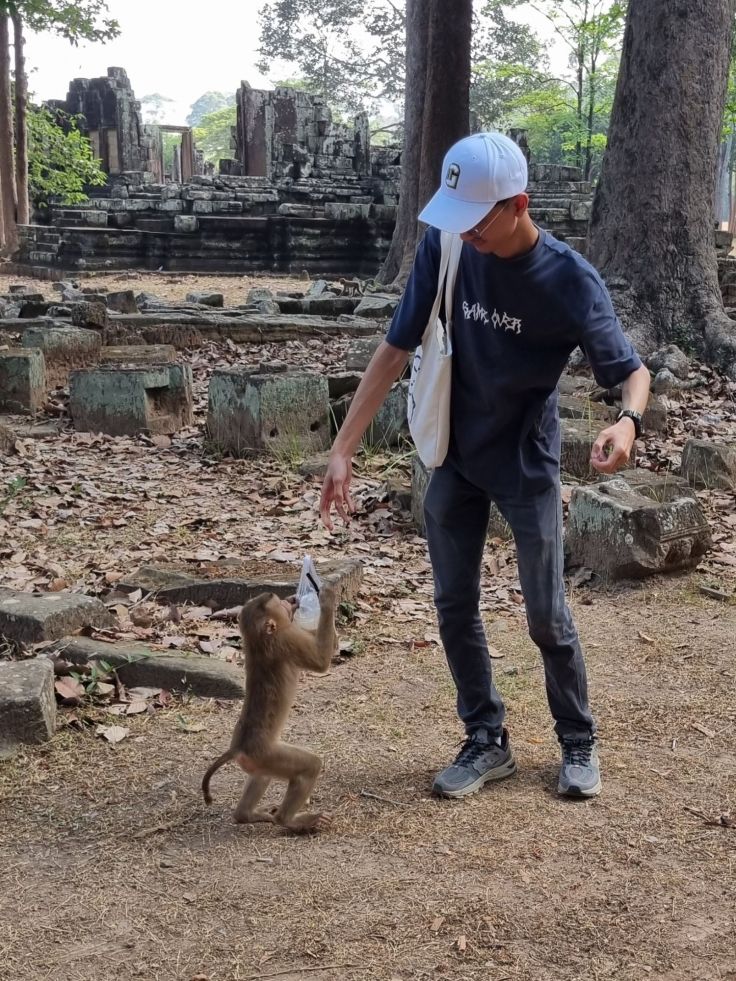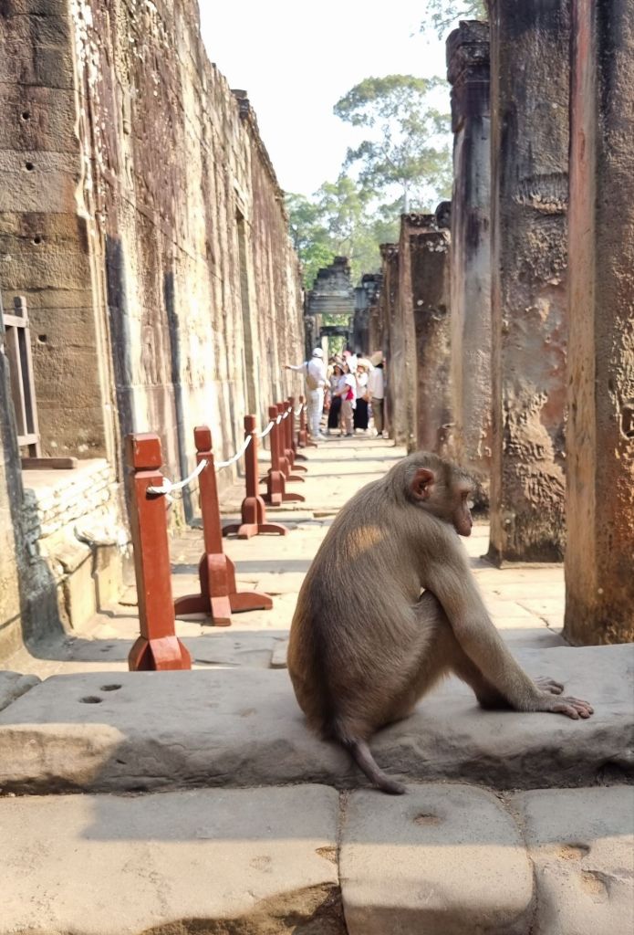 An dieser Stelle ist – wie auch in den Thailand-Blogs – eine Warnung vor der „Affenbande“ angebracht. So süß sie aussehen, wie sie über die Ruinen und durch die Bäume turnen, seid achtsam. Unsere Empfehlung: Nichts trinken außer Wasser und schon gar nichts essen (am besten auch nichts gut Riechendes im Rucksack haben). Wenn die Makaken etwas wollen, dann holen sie es sich – notfalls mit Gewalt. Der fotografierte Besucher hat sein Getränk nicht freiwillig abgegeben!
