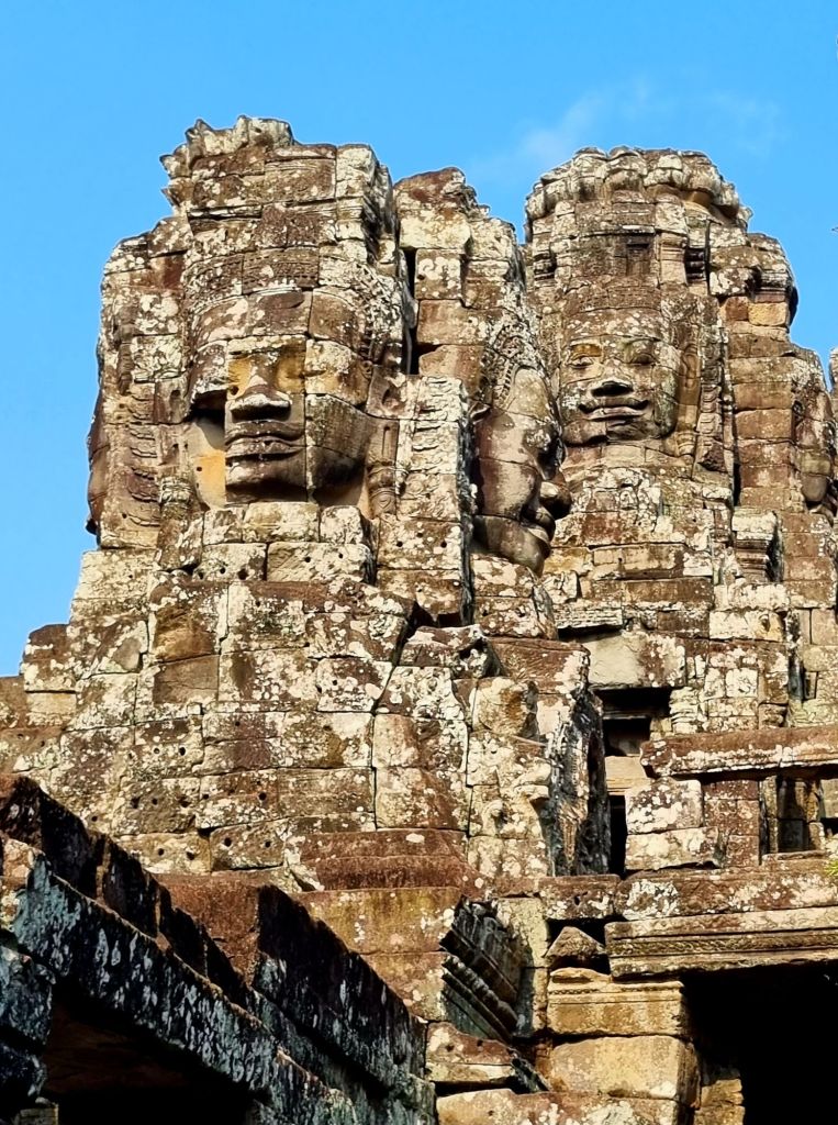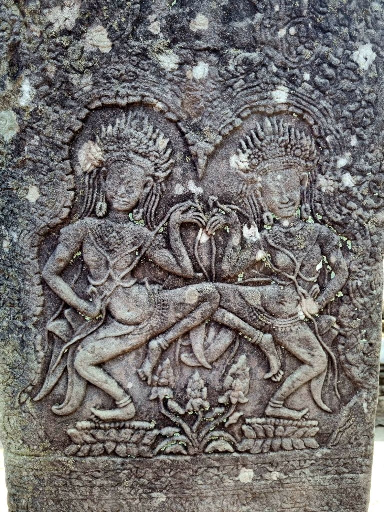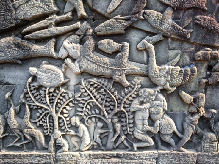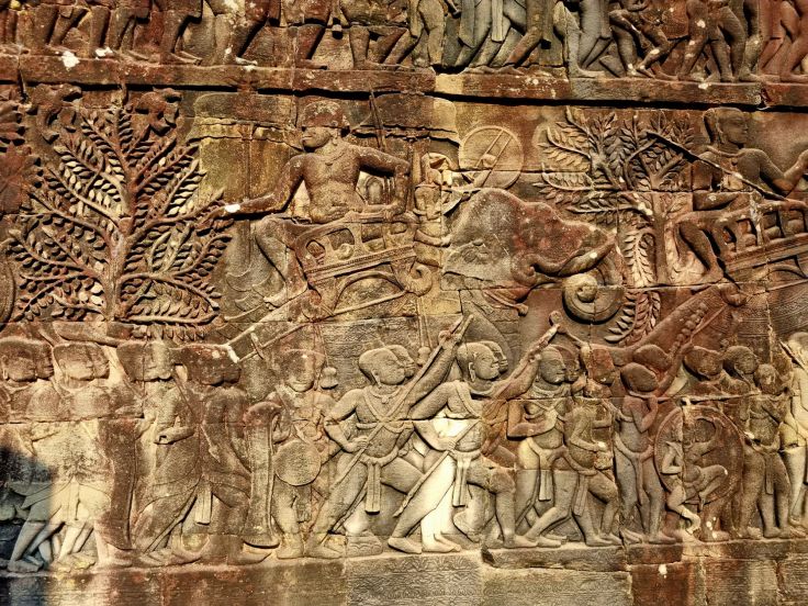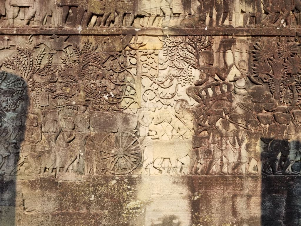 Mindestens ebenso beeindruckend wie die Gesichtstürme finden wir die zahlreichen Flachreliefs, sowohl in den Säulengängen und Mauern im Tempel, als auch an zwei Galerien um den Tempelberg herum. Uns haben sie insgesamt sogar besser gefallen als die Reliefs von Angkor Wat, da sie vielseitiger sind und „Geschichten erzählen“. Sie berichten von den wichtigsten Ereignisse der damaligen Zeit und von Themen des täglichen Lebens, zu sehen sind unter anderem Tänzerinnen, Krieger, Fischer, Bauern und zahlreiche Tiere.