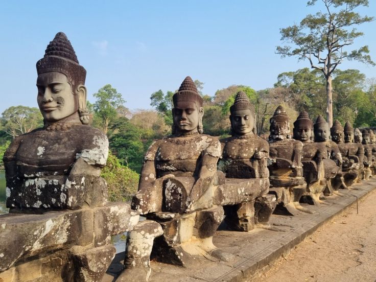 Angkor heißt übersetzt Stadt und in diesem Gebiet, das mit mehr als 1.000 Quadratkilometern Fläche größer ist als Berlin, finden sich neben Angkor Wat noch zahlreiche weitere Tempel und Palastanlagen. In der Blütezeit lebten hier bis zu eine Million Einwohner, etwa so viele wie heute in Köln. Nur dank eines für den Reisanbau notwendigen ausgeklügelten Bewässerungssystems, das in Teilen heute noch zu sehen ist, sowie der Nähe zu Südostasiens größtem See, dem fischreichen Tonle Sap, war es überhaupt zur damaligen Zeit möglich, solche Menschenmassen zu ernähren.
