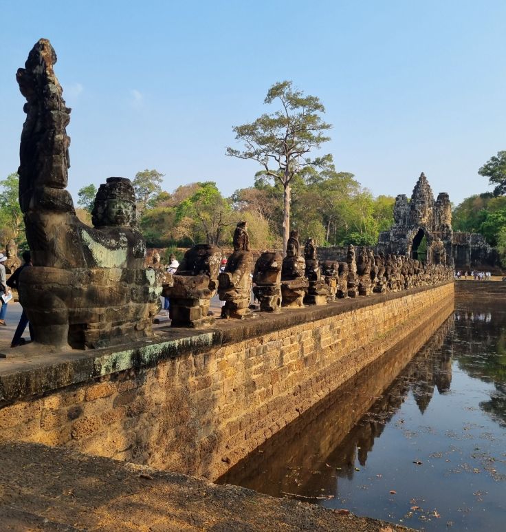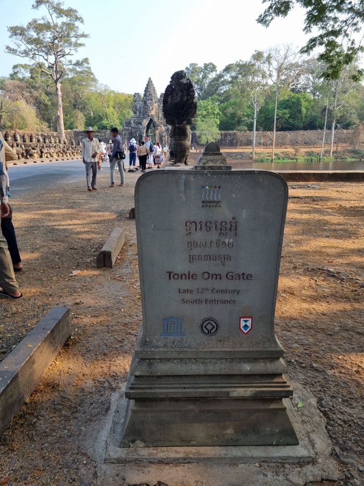 Die nächste Station unserer Angkor-Tour bildet das Tonle Om Gate, das südliche Tor von Angkor Tom. Es ist eines von fünf Stadttoren und das am besten restaurierte. Wir laufen auf das Tor zu auf einem großen Damm, der einen etwa 100 Meter breiten Graben überquert. Auf beiden Seiten des Damms befinden sich steinerne Riesen, die am Körper einer Naga-Schlange ziehen. Auf dem Tor sehen wir zum erstem Mal einen der berühmten Gesichtstürme von Angkor: Die lächelnde Gesichter blicken vom Tor in alle Himmelsrichtungen.