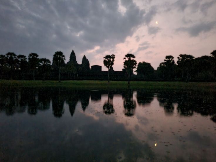 An unserem Angkor-Tag heißt es: Früh raus aus den Federn! Das kommt uns entgegen, denn auch heute soll es wieder über 40 Grad heiß werden. Wir haben den ganzen Tag einen Fahrer und Guide gemietet, die uns um 4:30 Uhr abholen. Um 5 Uhr öffnet das Ticketzentrum, wo wir fotografiert werden und unseren 1-Tagespass erhalten (1-Tagespass im April 24 37 US$, es gibt auch 3- und 7-Tagespässe), der dann auch gleich an einem der Checkpoints (und danach an mehreren Stellen in der Anlage) kontrolliert wird. Noch im Stockdunklen stolpern wir hinter der Taschenlampe unseres Guides mit Touristen aus aller Welt zum großen Teich vor Angkor Wat. Unser aller Ziel ist es, bei Sonnenaufgang die berühmten fünf Türme Angkor Wats zu fotografieren, die sich dann auch noch im Teich spiegeln. Wir finden einen Platz direkt am Wasser und müssen bis kurz vor 6 Uhr warten, bis sich das grandiose Schauspiel zeigt – es ist wirklich toll anzuschauen!