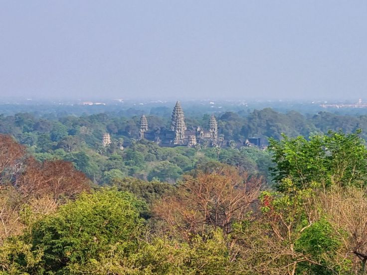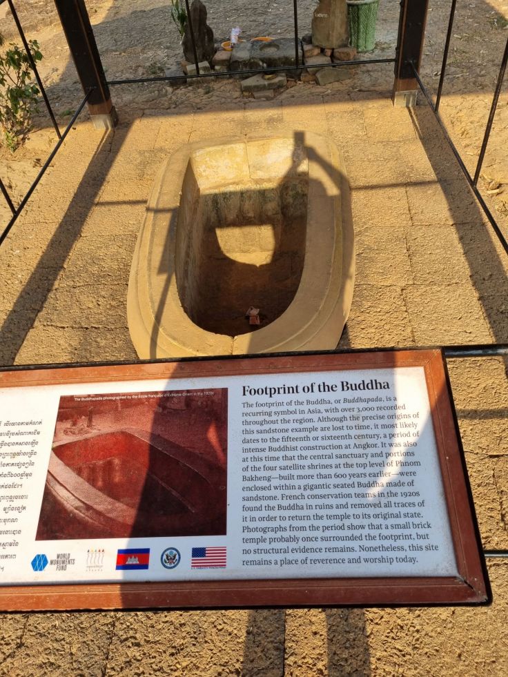 Oben angekommen, finden wir vor dem Tempel einen Fußabdruck Buddhas vor und müssen dann noch einmal eine steile Treppe nach oben zum Hauptschrein steigen – nun streiken die Mädels. Mein Mann und ich mobilisieren die letzten Reserven – wegen der versprochenen Aussicht. Und in der Tat sehen wir in der Ferne den Tonle Sap See und vor uns im Urwald Angkor Wat mit seinen fünf Lotustürmen. Das ist in der Tat ein schöner Abschluss unseres Angkor Tages!