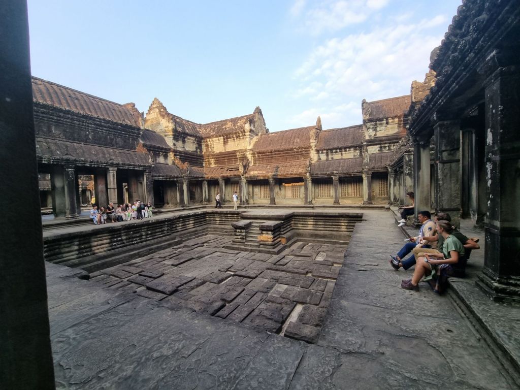 Anschließend nehmen wir erst einmal, neben zahlreichen Gleichgesinnten, in der Picknick-Area unser mitgebrachtes Frühstück ein, bevor wir über eine breite, von Nagas (mythologische Schlangen) flankierten Dammstraße, die Tempelanlage von Angkor Wat betreten. Die gesamte Tempelanlage misst mit ihren Sandsteingebäuden und den Wassergräben fast zwei Quadratkilometer und ist eines der größten religiösen Bauwerke der Welt. Ursprünglich war der Hindu-Tempel Vishnu geweiht, heute ist es, den religiösen Mehrheitsverhältnissen entsprechend, ein buddhistischer Tempel.