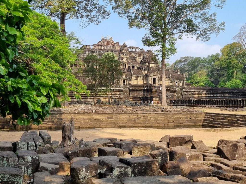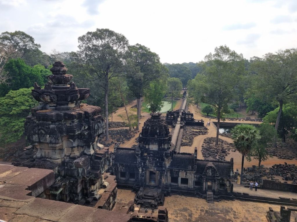 Neben dem Bayon Tempel können in Angkor Thom auch noch zahlreiche weitere Gebäude besichtigt werden. Unser Guide streikt jetzt schon und lässt uns den Baphuon Tempel (Pyramidentempel) mit seinen vier Terrassen, der fußläufig in nördlicher Richtung zum Bayon Tempel liegt, alleine erklimmen. Von oben haben wir eine gute Aussicht auf den 200 Meter langen Dammweg, der von Säulen gestützt wird, sowie einen der Teiche und den Urwald. Weiter geht es dann zu Fuß mit dem Guide, wir passieren den Phimeanakas Tempel, ebenfalls ein Pyramidentempel. In der Regenzeit (also nicht jetzt) ist er von Wasser umgeben. Auch die zahlreichen eingefassten Teiche, an denen wir entlang spazieren, sind größtenteils wasserlos. In ihnen badete die royale Familie – je nach Status (z.B. ob Königin oder Konkubine) in einem eigenen. Nach so viel wasserlosen Becken dürstet uns noch mehr und wir müssen alle erst einmal im Schatten eine kühle Kokosnussmilch trinken. Gestärkt geht es weiter zur Terrace of the Elephants, der königlichen Aussichtsplattform und zur Terrace of the Leper King (Lepra-König). An beiden befinden sich schöne Flachreliefs. Falls ihr ihn vermisst: Der royale Palast selbst war aus Holz gebaut und ist nicht mehr vorhanden.