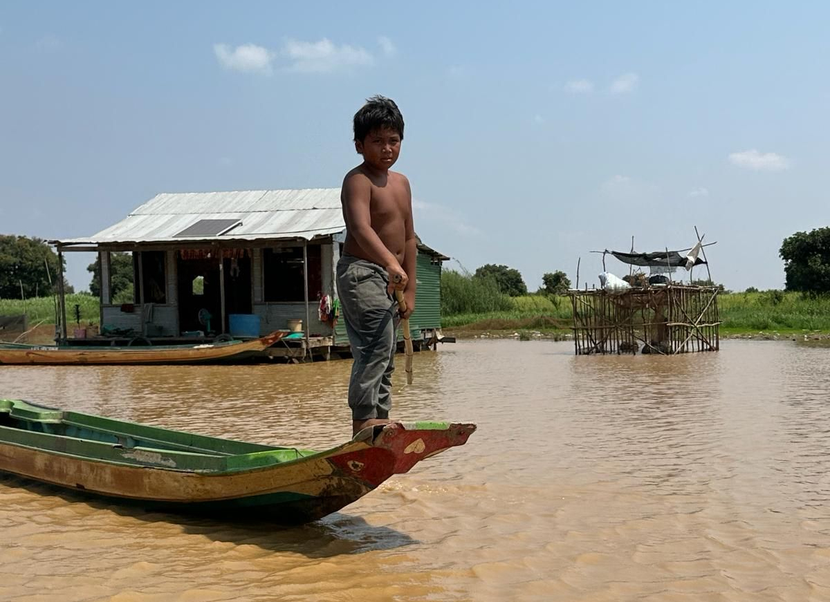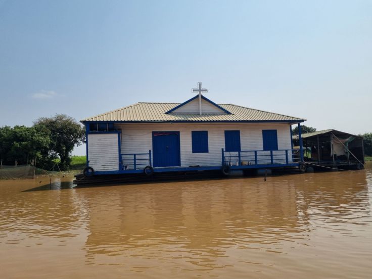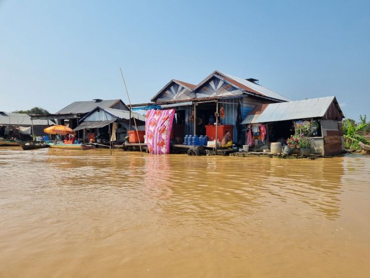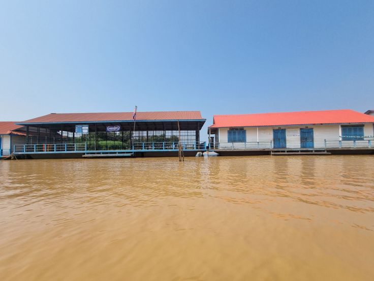 Das Dorf beginnt dort, wo sich der See in der Trockenzeit maximal zurückzieht und wir besteigen ein Longboat. In diesem passieren wir die Kirche, die Schule samt eingezäuntem Schulhof, Lebensmittelläden, kleine Kneipen und blicken in zahlreiche Wohnzimmer der schwimmenden Häuser. Aus vielen wird uns freundlich gewunken, außer uns ist nur ein einziges weiteres Touristenboot unterwegs. Etwa 80.000 Menschen leben insgesamt in solchen Floating Villages, meist in Pfahlbauten, seltener in Hausbooten, auf und von dem See.