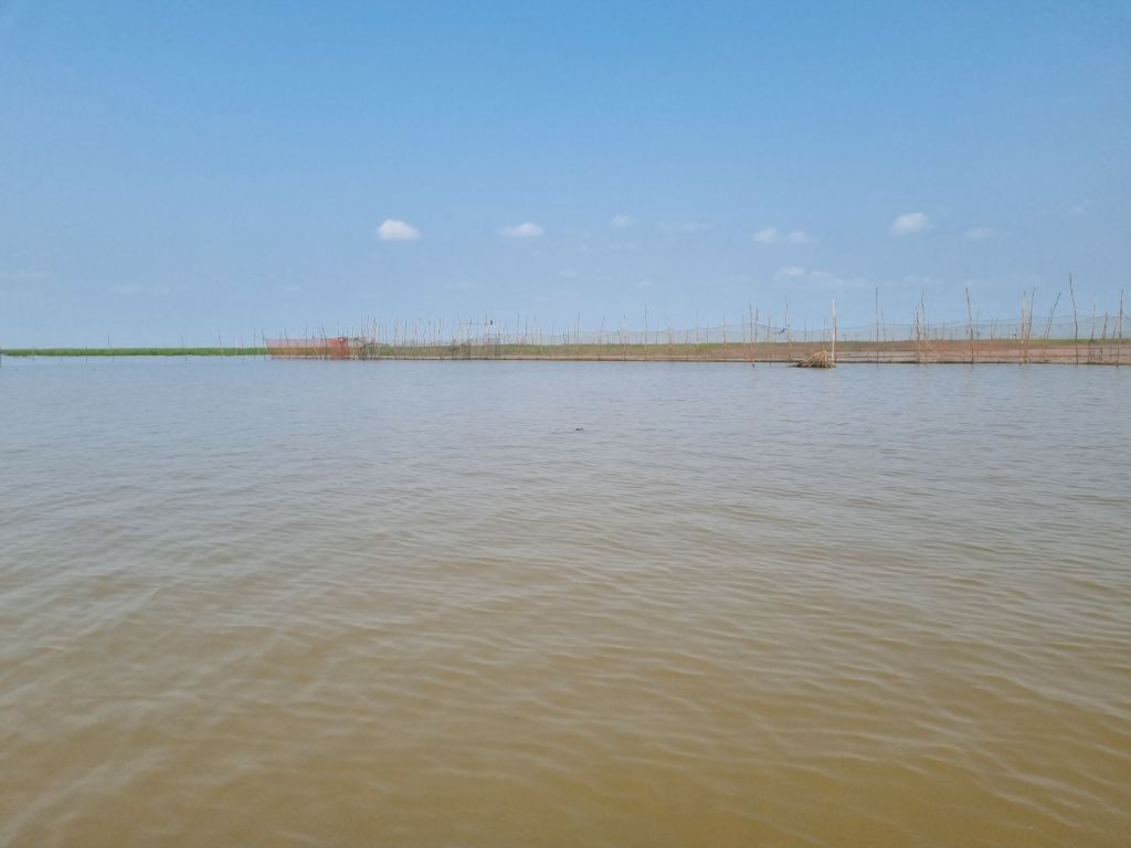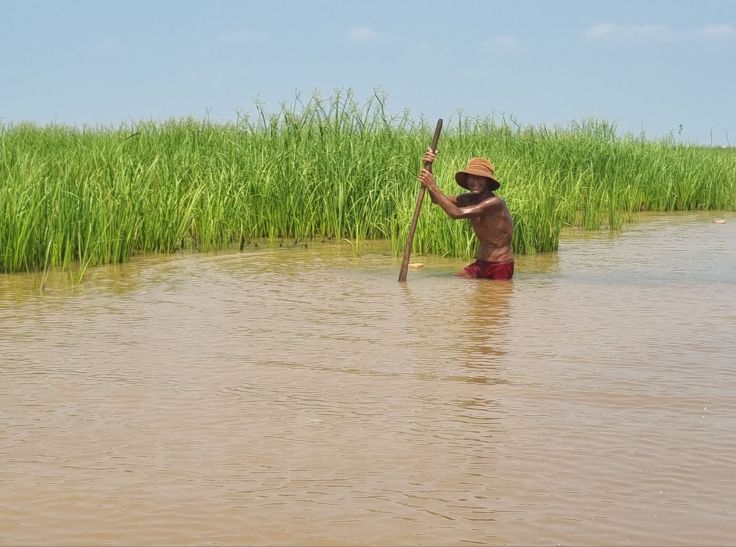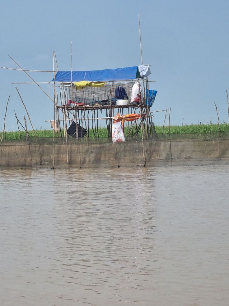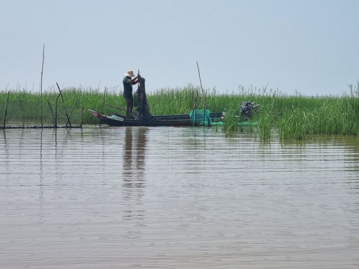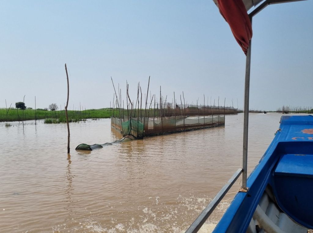 Etwas weiter im See werden die Häuser weniger, statt dessen können wir hier den Fischern bei der Arbeit zuschauen und deren Netzkonstruktionen bewundern. An den teils watenden Fischern ist zu sehen, dass der See insbesondere jetzt in der Trockenzeit sehr flach ist. Wir fahren eine ganze Weile auf einem immer breiter werdenden Seitenarm, an dessen Rand sich scheinbar endlos (Schilf-)Gräser und Mangroven erstrecken. Diese bilden den Schutz für die Kinderstuben der Fische. Schließlich kommen wir am „offenen See“ an, der sich hinter einer Reihe von Netzen bis zum Horizont erstreckt.