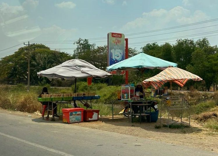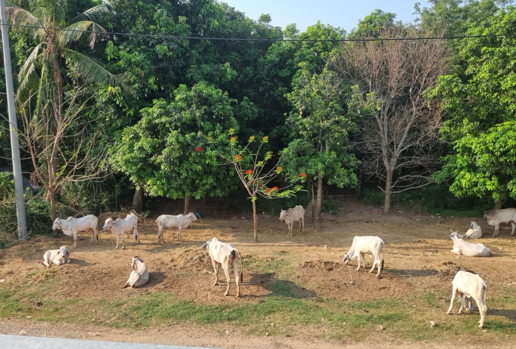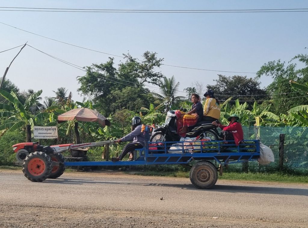 Dennoch genießen wir die Fahrt durch das Land zu unserer nächsten Station Battambang, denn es gibt immer etwas zu sehen: Figuren auf den Verkehrsinseln wie die Reisbäuerin oder Gottheiten, Tempel, interessant beladene Fahrzeuge, abenteuerliche Elektroinstallationen, Straßenstände, magere Zebu-Rinder. Jetzt in der Trockenzeit ist die (Reis-)Ernte eingefahren und es ist die Zeit für Hochzeiten. Bald lernen wir: Sobald wir laute Musik hören, bereitet sich eine Dorfgemeinschaft auf ein großes Fest vor: Stühle werden herangeschleppt und es wird dekoriert.