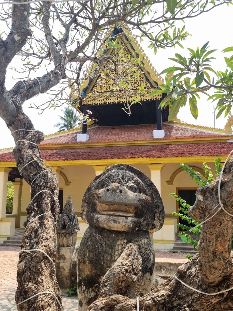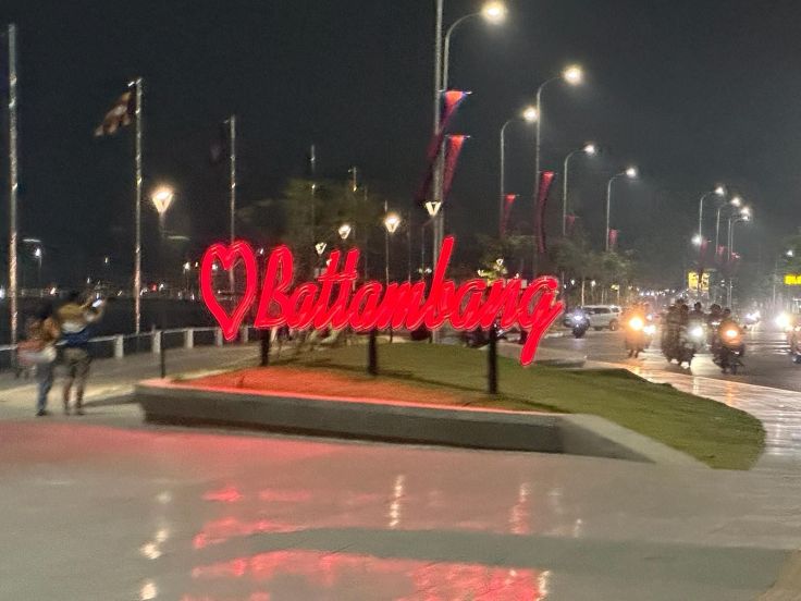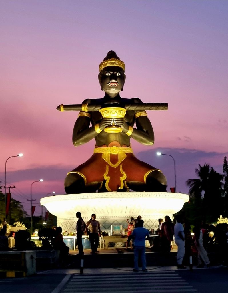 Mittlerweile ist es dunkel geworden, in der Stadt erstrahlen bunte Lichter und die Menschen kommen aus den Häusern, um die Kühle der Nacht zu genießen. Das buddhistische Neujahrsfest steht kurz bevor, weshalb einige Straßenzüge hübsch geschmückt sind. Wir schauen uns das Wahrzeichen der Stadt an, die Ta Dambong Statue oder den „Schwarze Mann von Battambong“ mit seinem Zauberstab, der auf einer Verkehrsinsel steht – ihm ist die Entstehung der Stadt zu verdanken. Dem Zauberstab messen die Einheimischen immer noch große Bedeutung bei. Täglich werden am Fuß der Statue zahlreiche Opfergaben hinterlassen, die nach einer gewissen Verweilfrist von den Spendern oder von Bedürftigen wieder abgeholt werden dürfen.