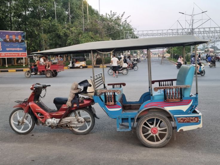 Um es vorweg zu nehmen: Der Tag in Battambang war – neben unserem Tag auf dem Thale Noi See in Thailand (siehe Südthailand: Wasserbüffel in einem Meer von Seerosen) unser schönster und erlebnisreichster Urlaubstag! Er beginnt am Vorabend mit einem abendlichen Besuch der zweitgrößten kambodschanischen Stadt, Battambang hat immerhin etwa 120.000 Einwohner. Unser Guide Sokha holt uns dafür standesgemäß mit seinem TukTuk im Hotel ab, in Kambodscha werden diese Fahrzeuge mit Motorrädern vorne und zweirädrigen Wägelchen hinten auch Remok genannt.