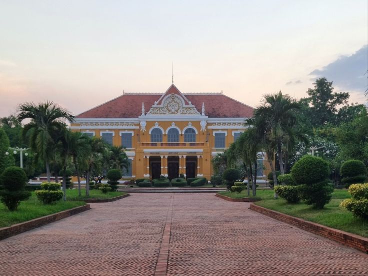 Als erstes bringt Sokha uns zur ehemaligen Gouverneurs Residence. Erbaut von einem italienischen Architekten für den letzten thailändischen Gouverneur Anfang des 20. Jahrhunderts, bezog kurz darauf der französische Gouverneur das schmucke Haus, das heute ein Museum ist. Vor seinen Toren hängen Plakate mit dem Unabhängigkeitsdenkmal im Angkor-Stil. Ein solches steht in jeder kambodschanischen Stadt, die etwas auf sich hält, auch in Battambang!