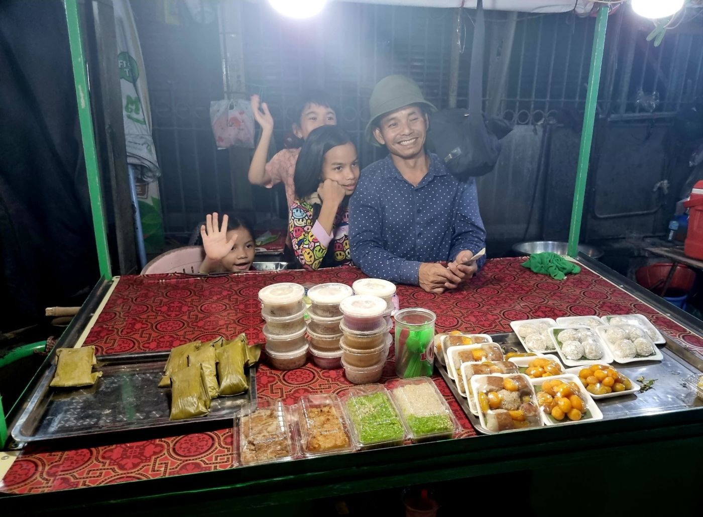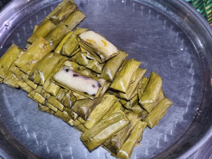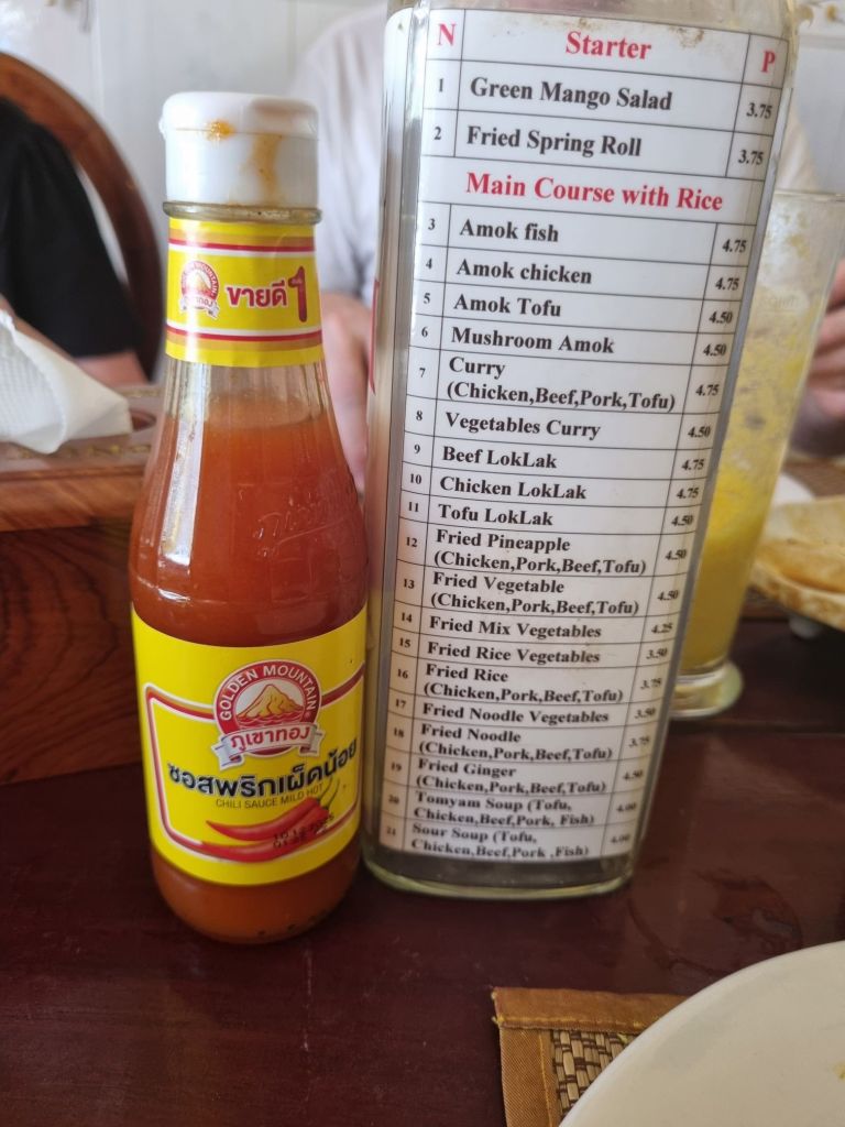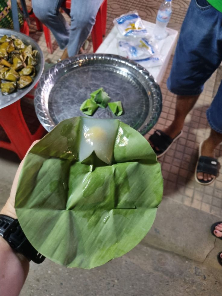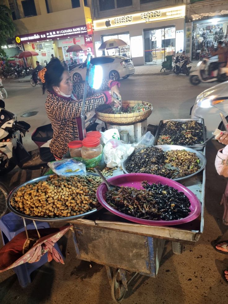 Die leckeren Opfergaben vor Augen, bekommen auch wir Hunger und Sokha nimmt uns mit auf den Nachtmarkt. Da brutzelt und duftet es von diversen Grills, wir probieren ein paar Spieße und dann vor allem Süßspeisen, in Blätter eingewickelte Reis- und Mungbohnen-Köstlichkeiten. Die Verkäufer und Verkäuferinnen freuen sich sichtlich, dass wir ausgerechnet ihren Stand erwählt haben und ihre Speisen kosten wollen. Obwohl wir danach schon ziemlich satt sind, führt uns Sokha auch noch in ein Restaurant, wo wir zwei kambodschanische Nationalgerichte, Beef LokLak – scharf angebratenes, mariniertes Rindfleisch, oft serviert mit Ei -, und Amok – ein Curry -, essen. Beides schmeckt prima und das Restaurant Coconut Lyly (hier werden auch Kochkurse angeboten, nur Facebook-Auftritt), können wir sehr empfehlen.