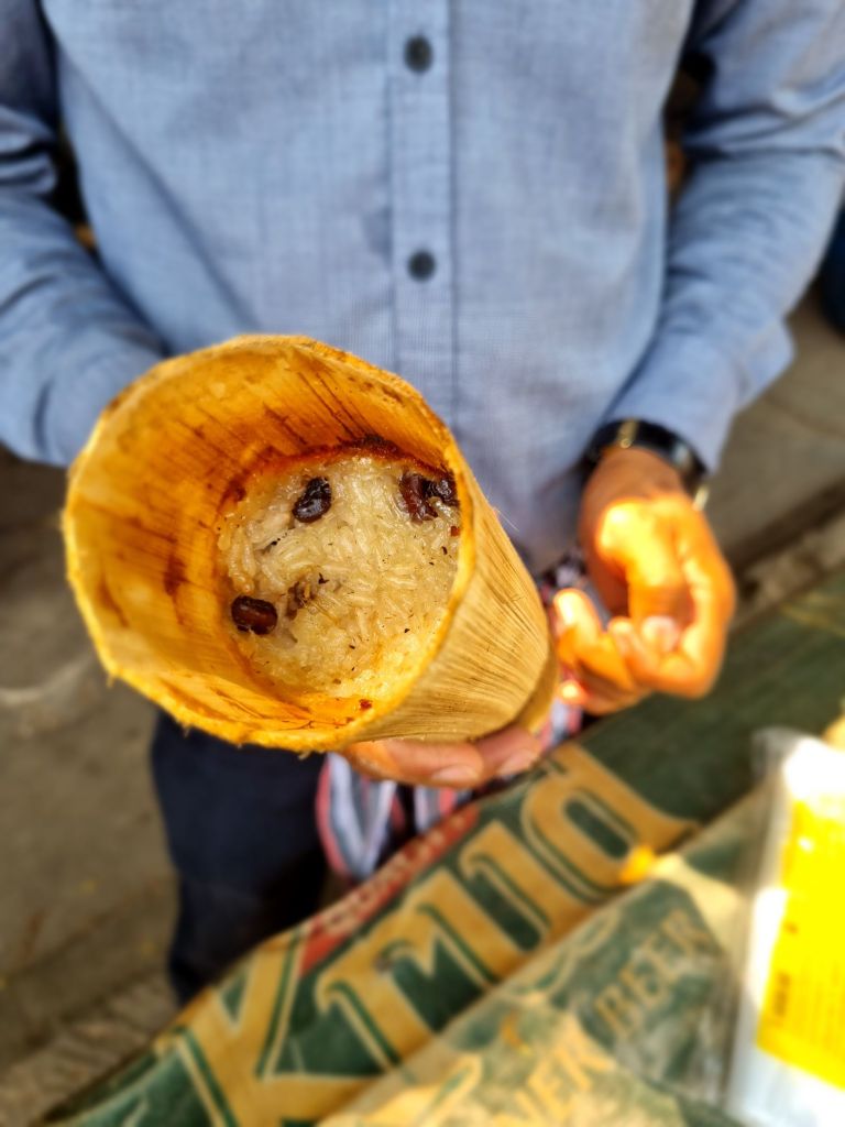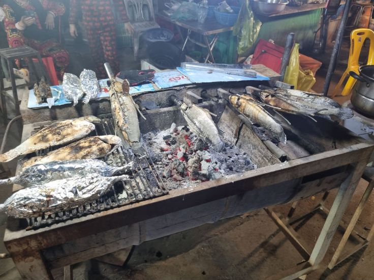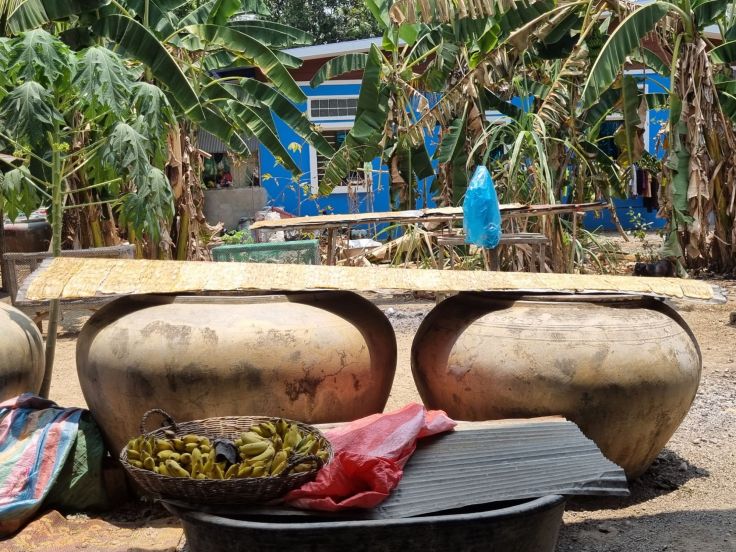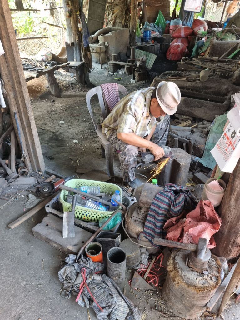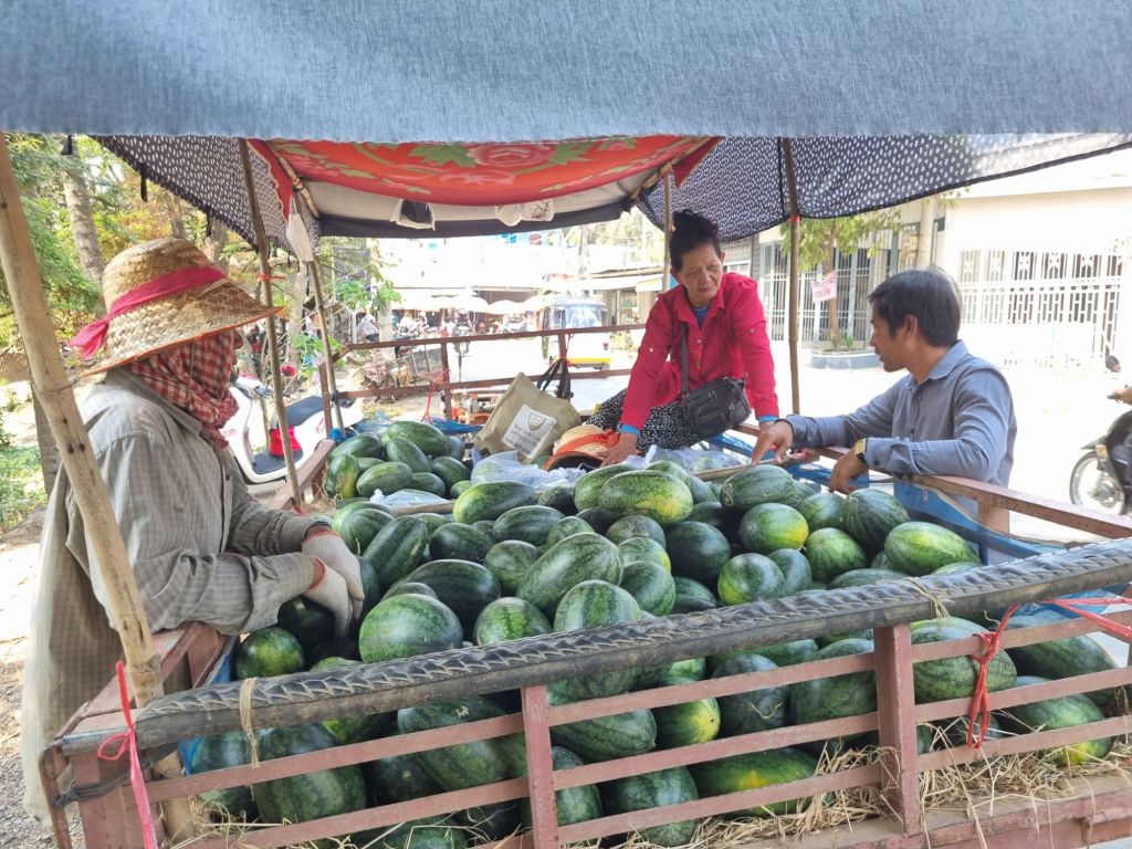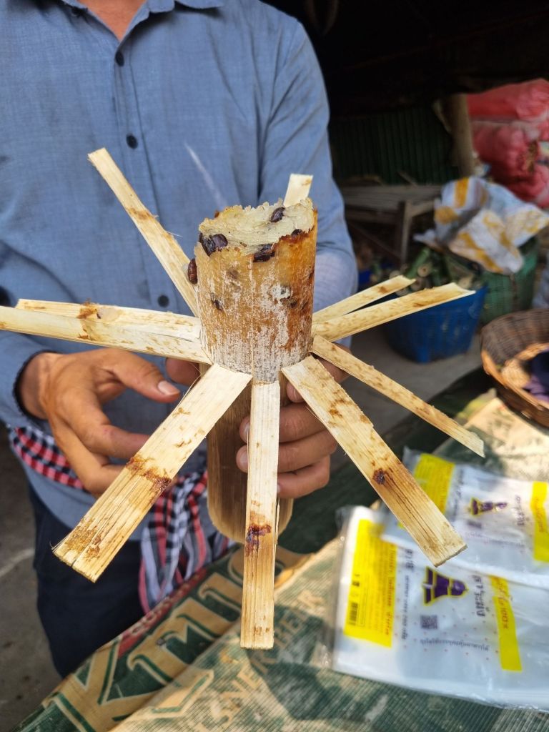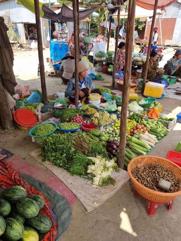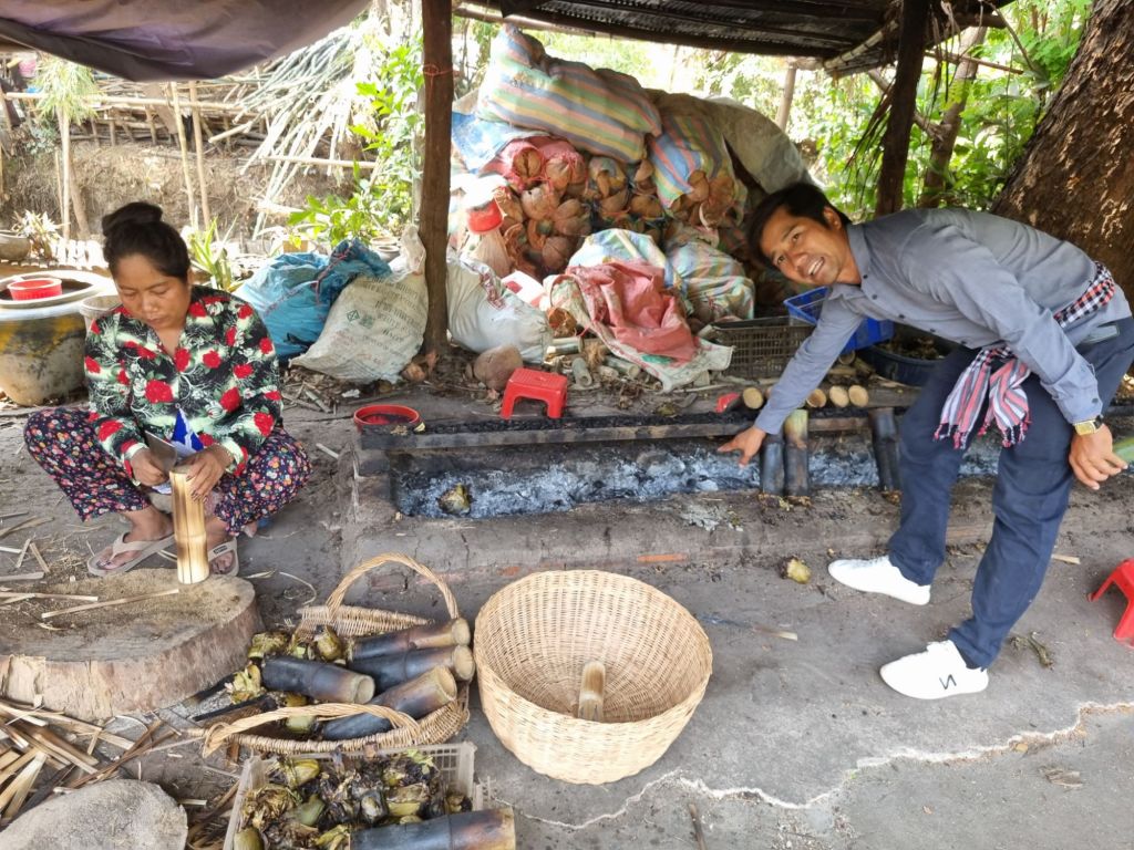 Anschließend nimmt uns Sokha mit in „seine Community“, er ist geboren in einem Stadtteil von Battambang. Dort besuchen wir zunächst einen Schmied, der aus einfachen Materialien vor allem landwirtschaftliche Geräte herstellt. Dann schlendern wir über den Markt, wo Sokha uns allerhand über den „Obst- und Gemüsegarten“ Battambangs mit seinen diversen Produkten erzählt. Da das Thermometer schon wieder über 40 Grad zeigt, kauft Sokha uns Wassermelonen, die wie Mangos gerade Saison haben. Er zeigt und erklärt uns auch, wie Bamboo Sticky Rice hergestellt wird: Klebreis wird mit Kokosnussmilch in einem ausgehöhlten Bambusrohr gegrillt, ein Snack mit eigener Verpackung, den wir schon in Thailand bewundert haben und auch hier gerne genießen.