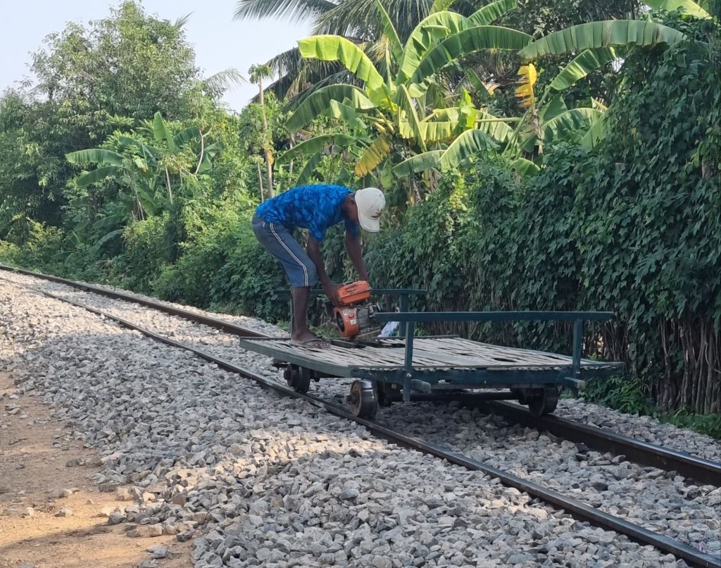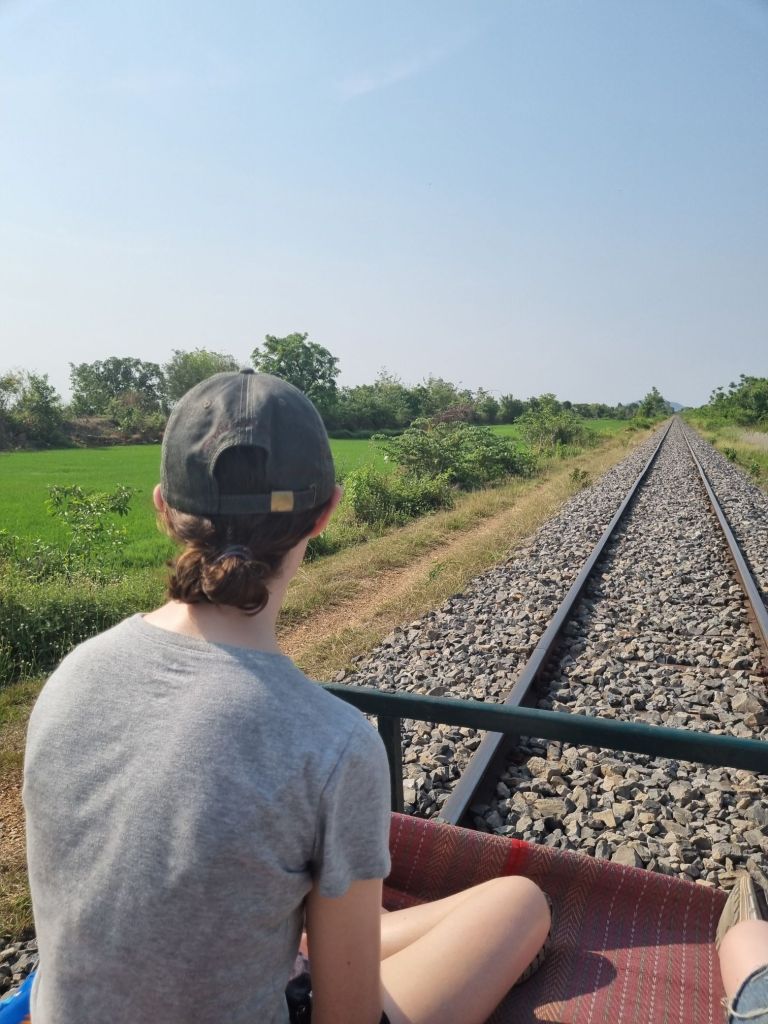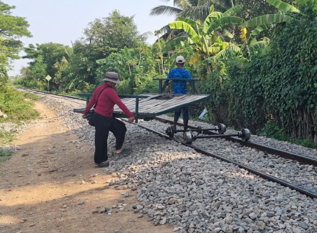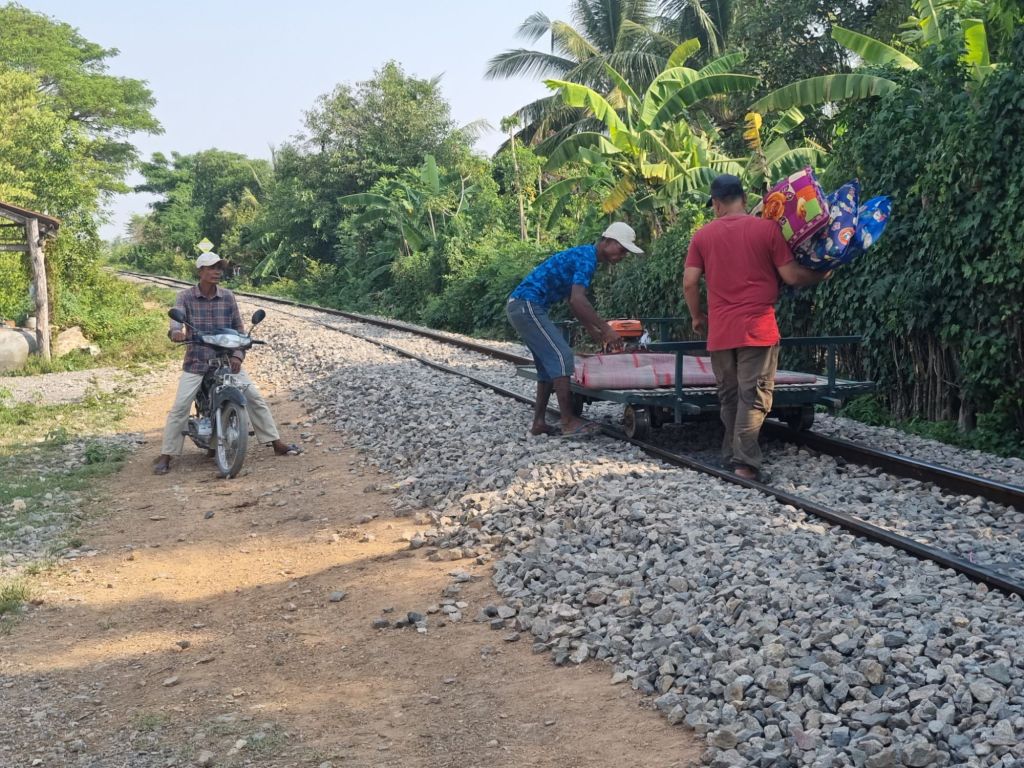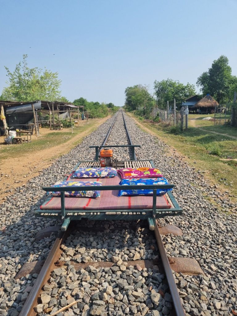 Am nächsten Morgen startet der Tag wieder in Sokhas Remok und er fährt uns als erstes zu einer der bekanntesten Touristenattraktionen der Stadt, dem Bamboo Train. Die einspurige Bahnstrecke wurde einst von den Franzosen erbaut und lag jahrzehntelang brach, bevor sie – nicht nur zum Vergnügen der Touristen, sondern auch für den Güter- sowie ein bisschen Personentransport zwischen Phnom Penh und Battambang – wieder aufgebaut wurde. Wir kommen an einer Art „Bahnhof“ an und staunen, wie dieser kleinste Zug der Welt, auch Norry genannt, in Minutenschnelle aufgebaut wird: zwei Achsen, eine Bambusplatte, ein 6-PS-Motor und Kissen – wir sind startklar! Mit immerhin bis zu 40 Stundenkilometern Geschwindigkeit brausen wir über die Strecke, vorbei an Reisfeldern und Lotusteichen. Nach wenigen Kilometern hält der Bamboo Train am nächsten Stopp, Getränke und Souvenirs werden angeboten. Dann wird das Wägelchen einfach umgedreht und es geht zurück. Doch was passiert, wenn sich zwei Norrys begegnen? Entweder muss der „Schwächere“, sprich der Leichtere oder schneller Abbaubare, weichen oder es wird eine Münze geworfen bzw. „SchnickSchnackSchnuck“ gespielt – das kennt man hier auch! Plötzlich stoppen wir und unser Schienentaxi wird von den Schienen genommen – ein Güterzug verfolgt uns und hier ist die Hierarchie eindeutig. Bis dieser vorbei ist, schauen wir dem Bauern mit seinen Enten zu und ein Reisfeld an, bevor es weiter zum Ausgangspunkt geht. Das Ganze ist natürlich sehr touristisch, aber wir haben auf jeden Fall unseren Spaß!