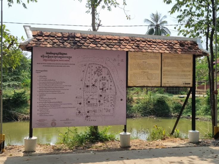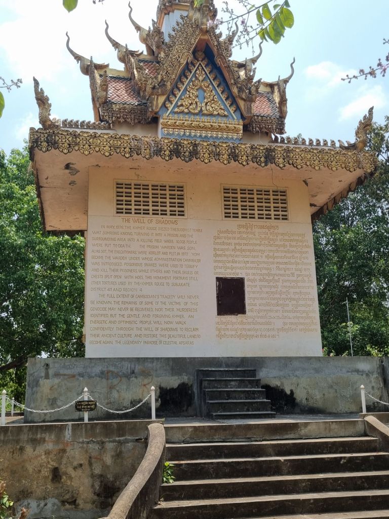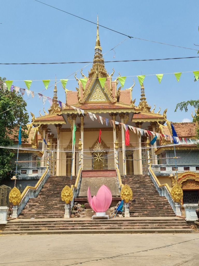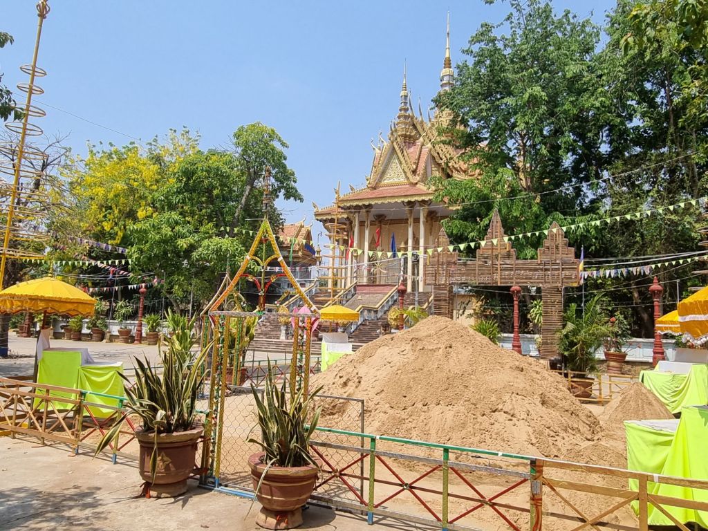 Anschließend geht es zurück in die Stadt, unser nächster Halt ist am Tempel Wat Samrong Knong. Dessen alter Teil wurde von den Roten Khmer als Gefängnis benutzt. Der neue Teil ist hübsch geschmückt zum buddhistischen Neujahrsfest. Zwischen den beiden Gebäuden haben die Gläubigen Sand aufgeschüttet, eine Tradition zum Neujahrsfest: Jede/r bringt etwas Sand zum Tempel und baut diesen quasi symbolisch auf.