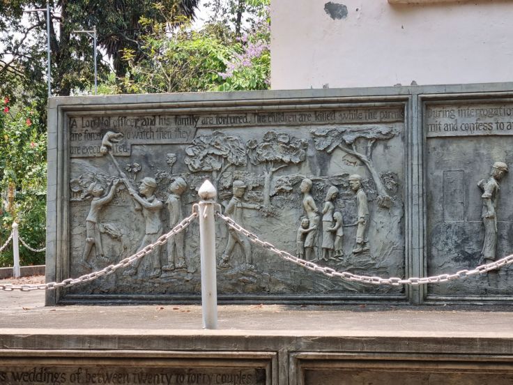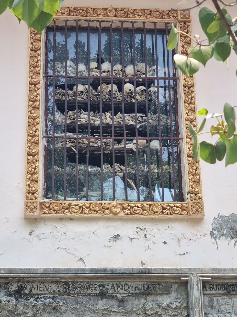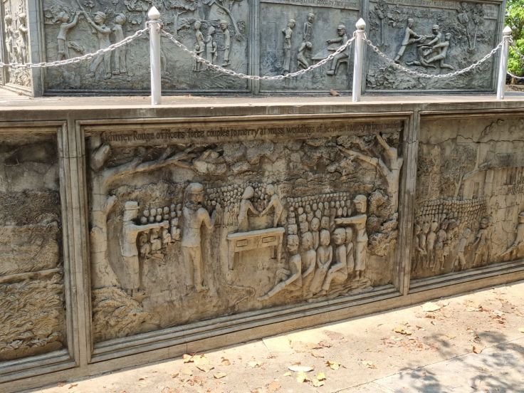 Hinter dem Tempel ist eines der Killing Fields der Roten Khmer. 10.000 Menschen fielen in der Region um Battambang der Schreckensherrschaft unter Pol Pot zum Opfer, ein Teil von ihnen wurde direkt hinter dem Tempel ermordet und in einem Massengrab verscharrt. Mönche gruben die sterblichen Überreste wieder aus und errichteten eine Gedenkstätte mit deren Gebeinen. Um dieses Gebeinhaus herum verläuft eine Mauer mit Reliefs, die die Gräueltaten der Roten Khmer darstellen: Kinder werden von ihren Eltern getrennt oder vor deren Augen ermordet, Intellektuelle werden aus den Städten auf’s Land verschifft, zur Zwangsarbeit gezwungen oder gleich ermordet, Massenhochzeiten werden durchgeführt, um eine neue Generation entstehen zu lassen, die – getrennt von den Eltern – indoktriniert werden kann. Unsere Kinder können kaum glauben, dass dies noch gar nicht lange her ist und zu Lebzeiten ihrer Eltern geschah – die Schreckensherrschaft dauerte zwischen 1975 und 1979. Unseren Guide Sokha ist mit fast 40 Jahren zu jung, er hat das nicht persönlich miterlebt, aber die Erzählungen nehmen ihn sichtlich mit.