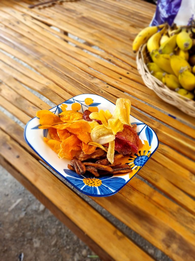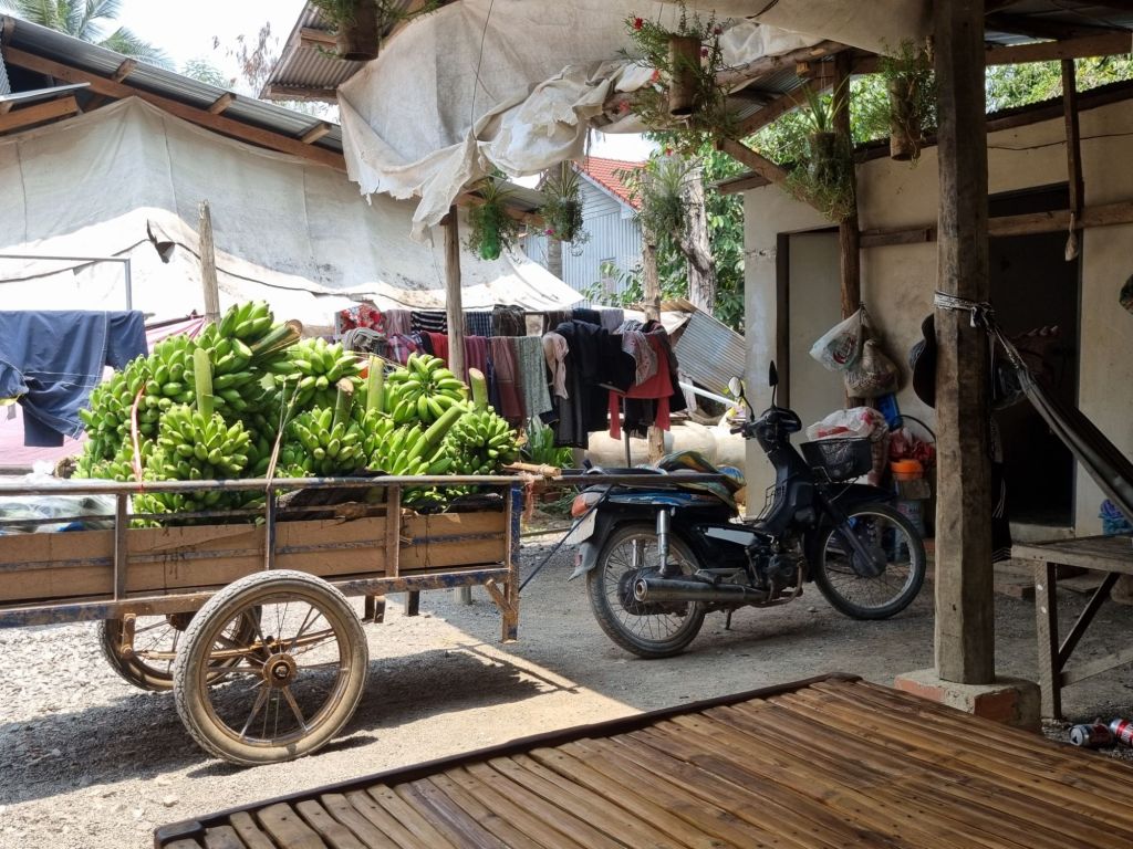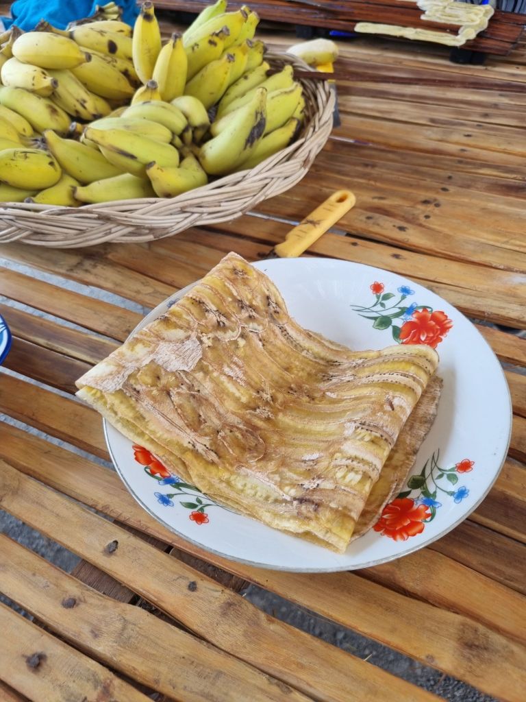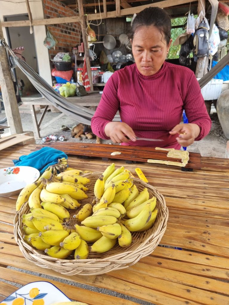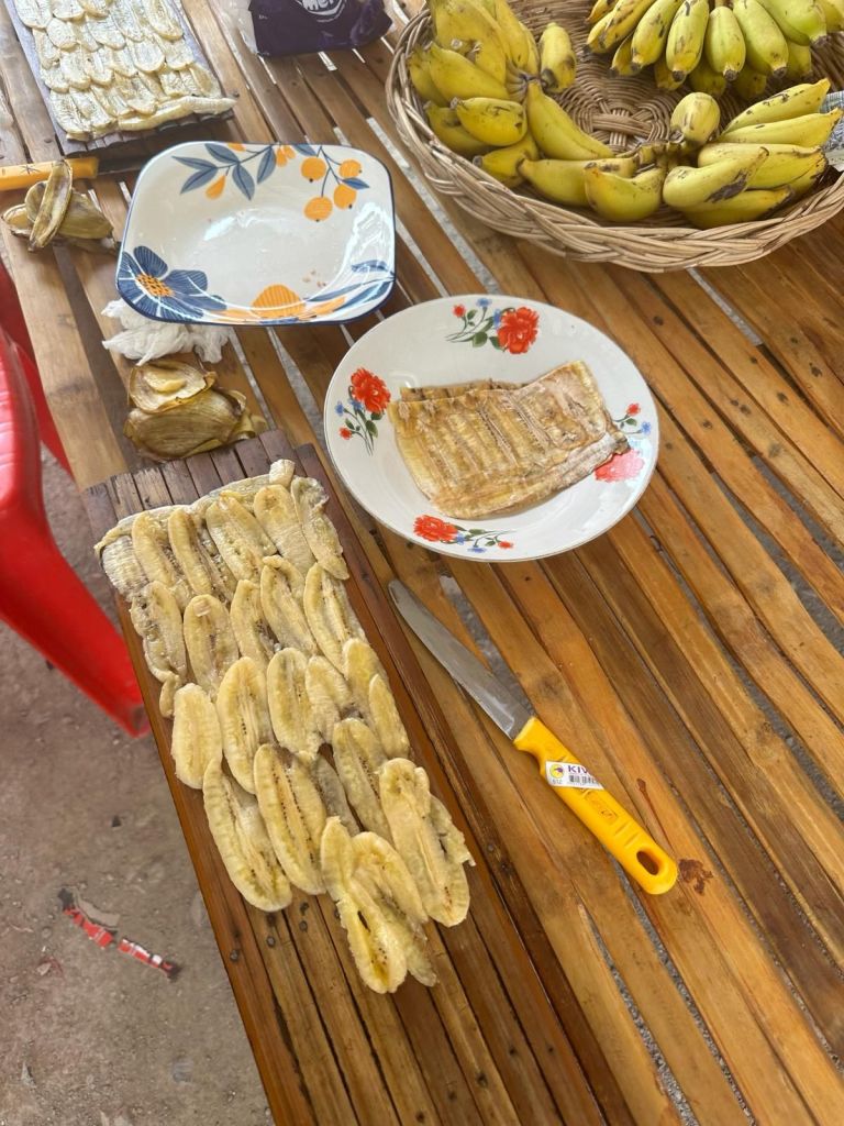 Weiter geht es zum nächsten Genuss: Sokhas nimmt uns mit zu Freunden, die Bananenprodukte herstellen. Mehr als 15 verschiedene Bananensorten gibt es um Battambang und in dieser Familie werden sie auf verschiedene Arten haltbar gemacht. Das geschieht einmal durch Frittieren, aber auch durch Trocknen, bei dieser Hitze ist es eher ein „Braten“ auf großen Metallplatten in der Sonne. Wir versuchen auch mit unterschiedlich ausgeprägtem Geschick daran, mit einem Messer möglichst dünne Bananenscheiben abzuschneiden und diese für den Trocknungsvorgang eng nebeneinander zu legen; ich gebe bald auf und koste lieber die verschiedenen Produkte. Von den unterschiedlich farbigen, extrem leckeren frittierten Bananenchips nehmen wir einige Tüten mit nach Hause!