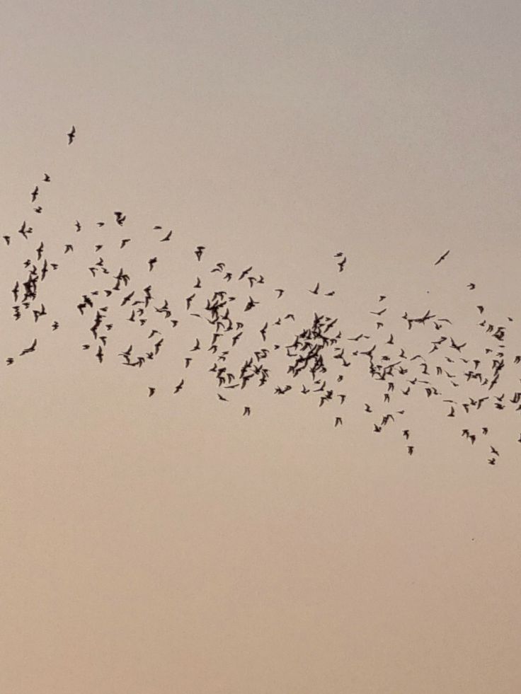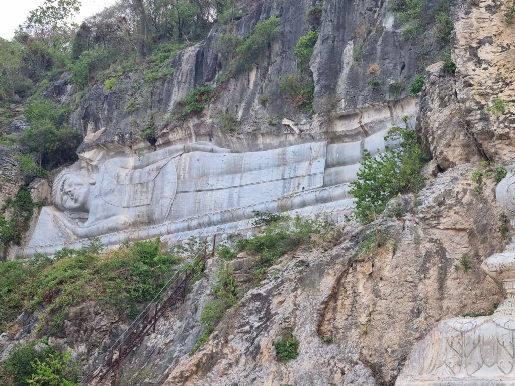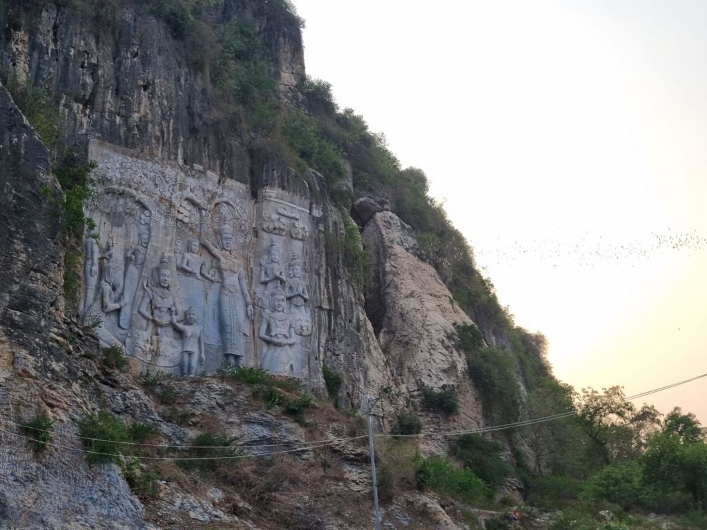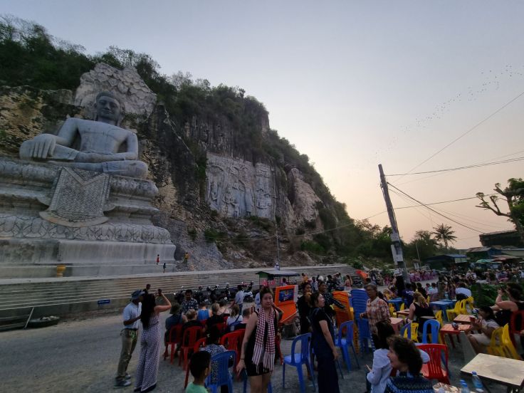 Bei einer Station streiken wir: der Fisch(pasten)Fabrik, die auch um diese Uhrzeit – früher Nachmittag – nicht mehr aktiv ist. Über 40 Grad und dann noch ein sehr strenger Geruch, das muss heute nicht sein. Wir nehmen lieber eine kleine Auszeit im Hotel, bevor es am späten Nachmittag zu einer weiteren Attraktion geht: der Fledermaushöhle. Diese befindet sich unterhalb des Phnom Sampov Mountain, auf dessen Spitze sich ein Tempel mit guter Aussicht auf das Umland befindet – in Anbetracht der Temperaturen haben wir diesen Programmpunkt ebenfalls gestrichen. Nicht entgehen lassen wollten wir uns aber das abendliche Schauspiel an der Bat Cave. Durch ein Tempeltor samt Elefant kommen wir kurz nach 17 Uhr mit Sokhas Remok vor der Höhle an und staunen über die Busladungen von Touristen. Netterweise werden diese wohl fast alle „gezwungen“, sich Stühle und teils auch Tische sowie Abendessen zu mieten, weshalb sie brav sitzenbleiben. Wir bevorzugen es, „frei herumzulaufen“ und bewundern zunächst die in den Kalkstein des Berges geschlagenen Reliefs. Langsam geht die Sonne unter und das Spektakel beginnt: Millionen Fledermäuse fliegen jeden Abend aus einer der Höhlen aus zur Nahrungssuche. So etwas haben wir noch nicht gesehen, der Strom hört gar nicht mehr auf, obwohl wir bestimmt 30 Minuten lang das Spektakel beobachten. Parallel erfahren wir weitere interessante Dinge von Sokha, zum Beispiel, dass die benachbarte Höhle auch als „Killing Cave“ bekannt ist, weil hier die Roten Khmer ihre Opfer „entsorgten“.
