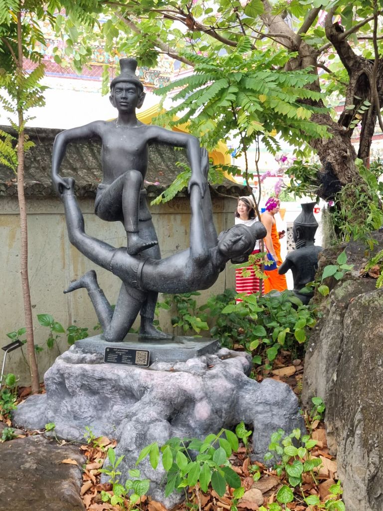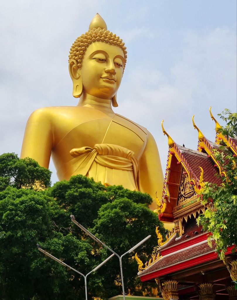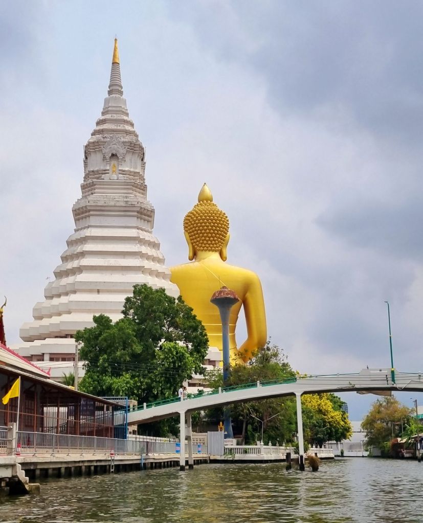 Auch einige Tempel passieren wir, darunter einer, den wir noch nicht kennen: Wat Paknam Phasi Charoen mit seinem riesigen goldenen Buddha. In seinem Lotussitz misst er stolze 69 Meter und blickt seit 2021 friedvoll meditierend über die „Stadt der Engel“, wie Bangkok wegen der wörtlichen Übersetzung seines traditionellen Namens „Krung Thep“ auch genannt wird. Vor dem Tempel füttern wir Fische mit mitgebrachtem Brot, das bringt Punkte auf dem Karma-Konto.