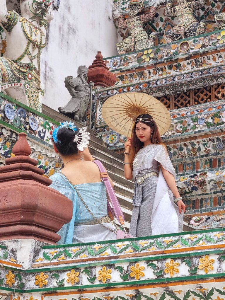 Aber auch tagsüber ist der Tempel mit seinen Mosaiken und Ornamenten aus bunter Keramik, vor allem Blumen- und Blattmuster, absolut sehenswert und dekorativ. Das finden auch zahlreiche vor allem asiatische Touristen, die sich hier traditionelle Kleidung ausleihen und anschließend ausgiebig fotografieren. Dieses Spektakel ist fast genau sehenswert wie der Tempel selbst …