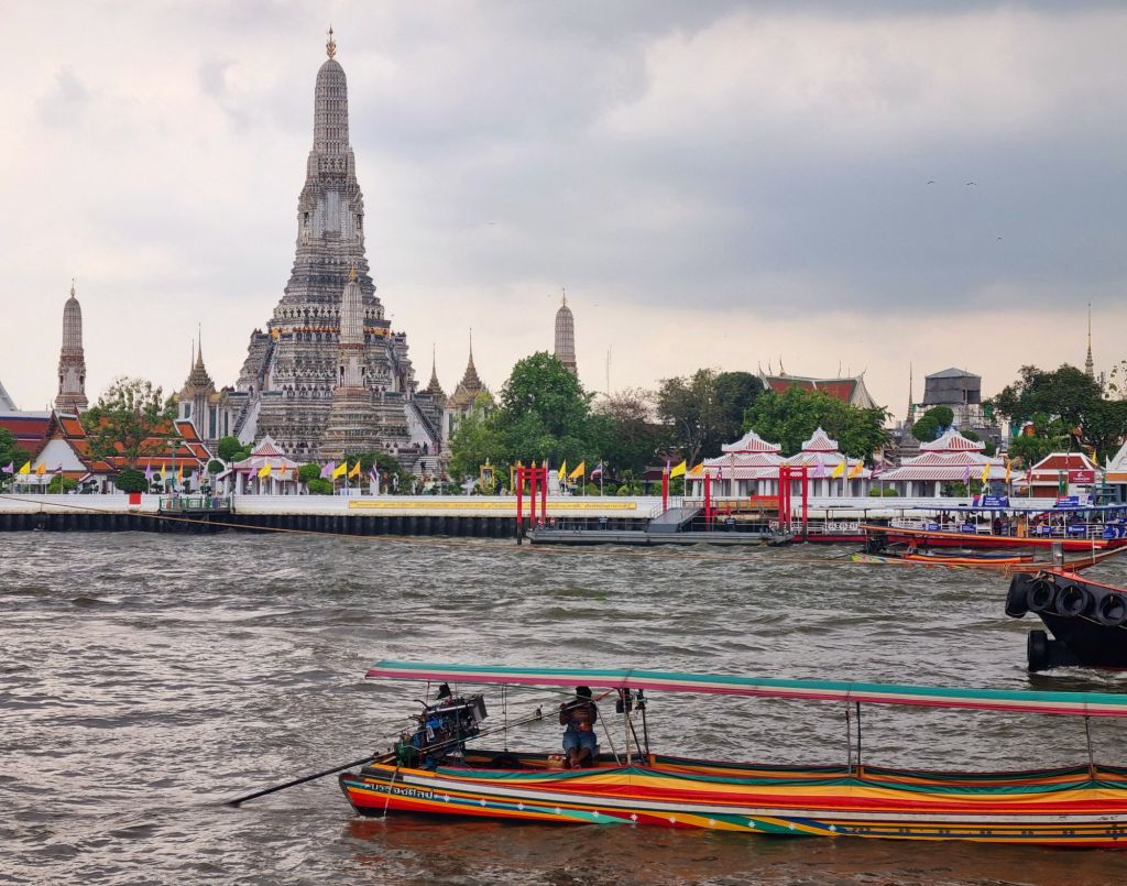 Als Hotelstandort haben wir Silom gewählt, da wir fußläufig zum Chao Praya Fluss wohnen wollten. Wer schon einmal in Bangkok war, kennt die Dauerstaus in vielen Straßen und weiß, wie viel schneller und stressfreier es ist, die Wasserstraßen zu nutzen. So nehmen auch wir an unserem ersten Tag von der Station Sathorn ein Expressboot zum Royal Palace (Station Tha Chang). Falls noch nicht geschehen, kann man direkt an der Wasserhaltestelle die typischen thailändischen Elefantenhosen kaufen (Besichtigung des Palasts und vieler Tempel nur mit bedeckten Schultern und Knien erlaubt), überraschenderweise kosten diese trotz der Lage nur 100 Baht (ca. 2,50 Euro).