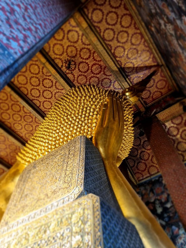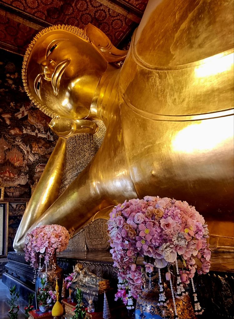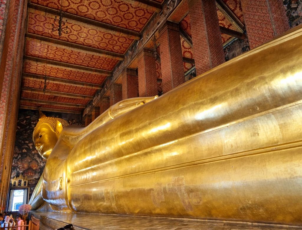 Südlich des Royal Palace liegt der buddhistische Tempel Wat Pho, auch Tempel des liegenden Buddha genannt. Wie der Tempel in Nakhon Si Thammarat ist auch dieser ein königlicher Tempel Erster Klasse und eine der Hauptsehenswürdigkeiten Bangkoks. Seiner Berühmtheit entsprechend zieht es die meisten Besucher sofort zum liegenden Buddha: 46 Meter lang und 15 Meter hoch ist die vergoldete Figur. Das Gebäude, in dem er ruht, wurde erst nach Erschaffung der gewaltigen Statue errichtet – sein Gewicht macht einen Transport unmöglich.