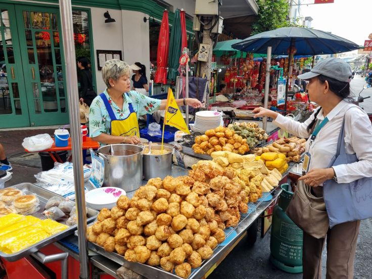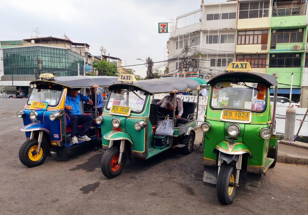 Vom Blumenmarkt ist es nur ein weiterer kleiner Fußmarsch nach Chinatown. Eigentlich sollte man sich diesen Stadtteil bei Nacht anschauen, wenn alles leuchtet und blinkt, das schafft noch einmal eine besondere Atmosphäre, wie wir aus vergangenen Besuchen wissen. Wir haben um unser Hotel jedoch (Nacht-)Markt genug, der auch noch günstiger ist, und verbringen die Abende lieber dort. Dennoch ist Chinatown natürlich auch tagsüber mit seiner quirligen Geschäftstätigkeit einen Besuch wert und wir erstehen auch einige leckere Köstlichkeiten an den Straßenständen. Danach nehmen wir von hier aus endlich mal ein TukTuk zurück ins Hotel. Halsbrecherisch, aber sehr geschickt, schlängelt sich der Fahrer durch den dichten Verkehr – auch das eine Erfahrung, die in Bangkok nicht fehlen darf! Übrigens hat uns trotz durchschnittlich 37 Grad tagsüber wider Erwarten kein Smog die Besichtigungstouren vermiest.